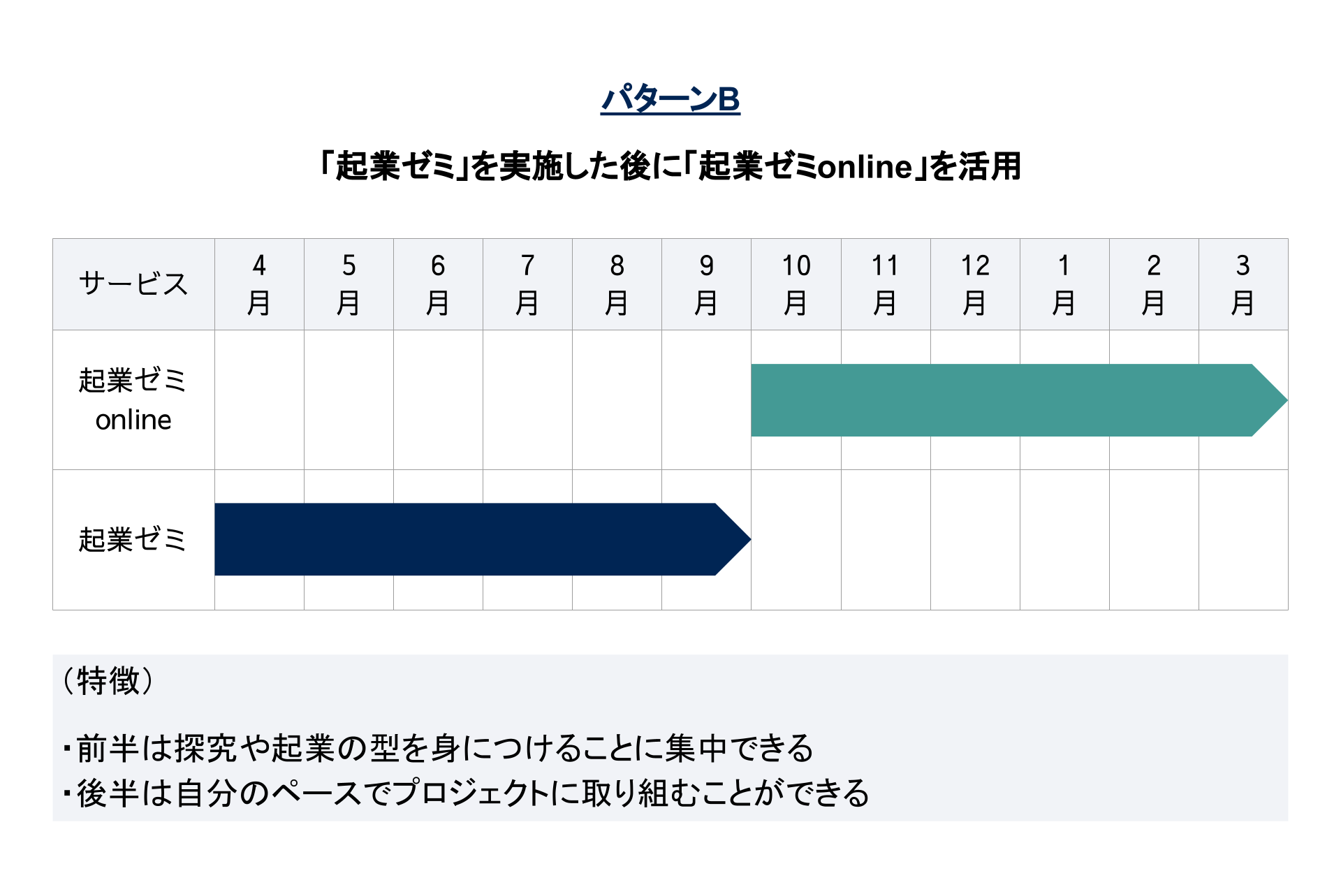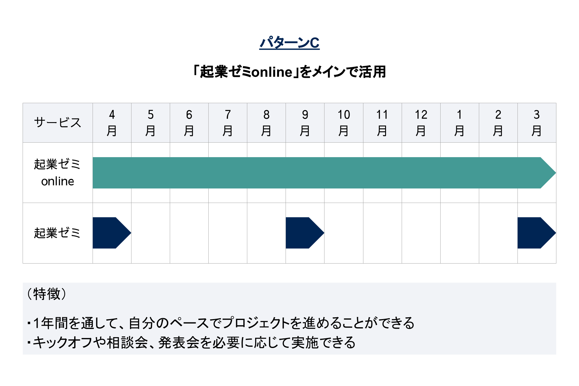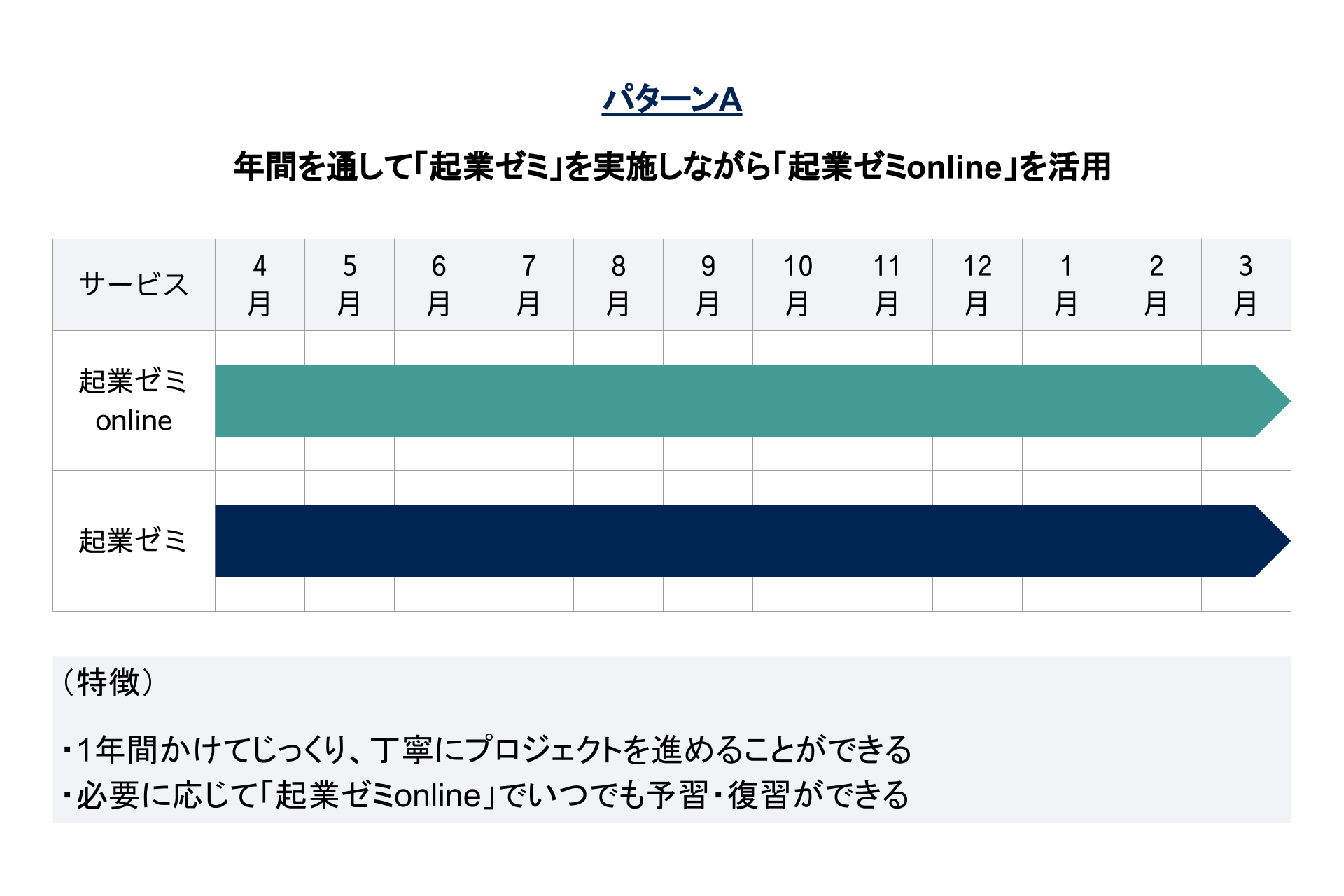 ライブとオンデマンドの両方のメリットを活かしたハイブリッド学習を行うことで、生徒たちはより質の高い探究活動を行えるようになります。(「起業ゼミ」の回数や実施場所、内容は学校の実情やカリキュラムに合わせて柔軟に変更可能。)