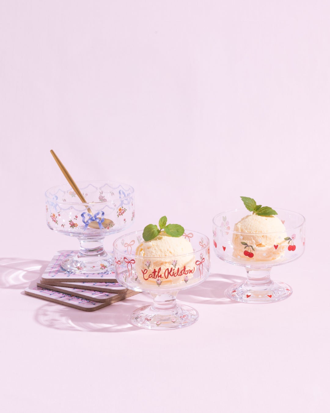 どこかレトロで懐かしさのあるデザートグラス。クリアなガラスにCath Kidstonのアートが際立