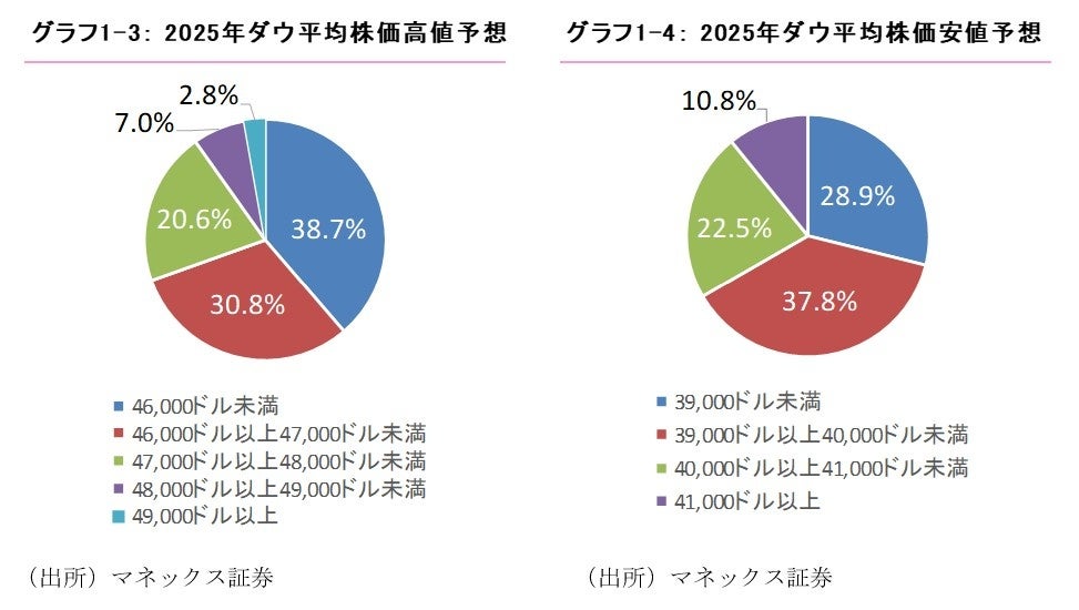 (1-2)2025年のダウ平均株価の高値予想は「46,000ドル未満」が最多、安値予想は「39,000ドル以上40,000ドル未満」が最多