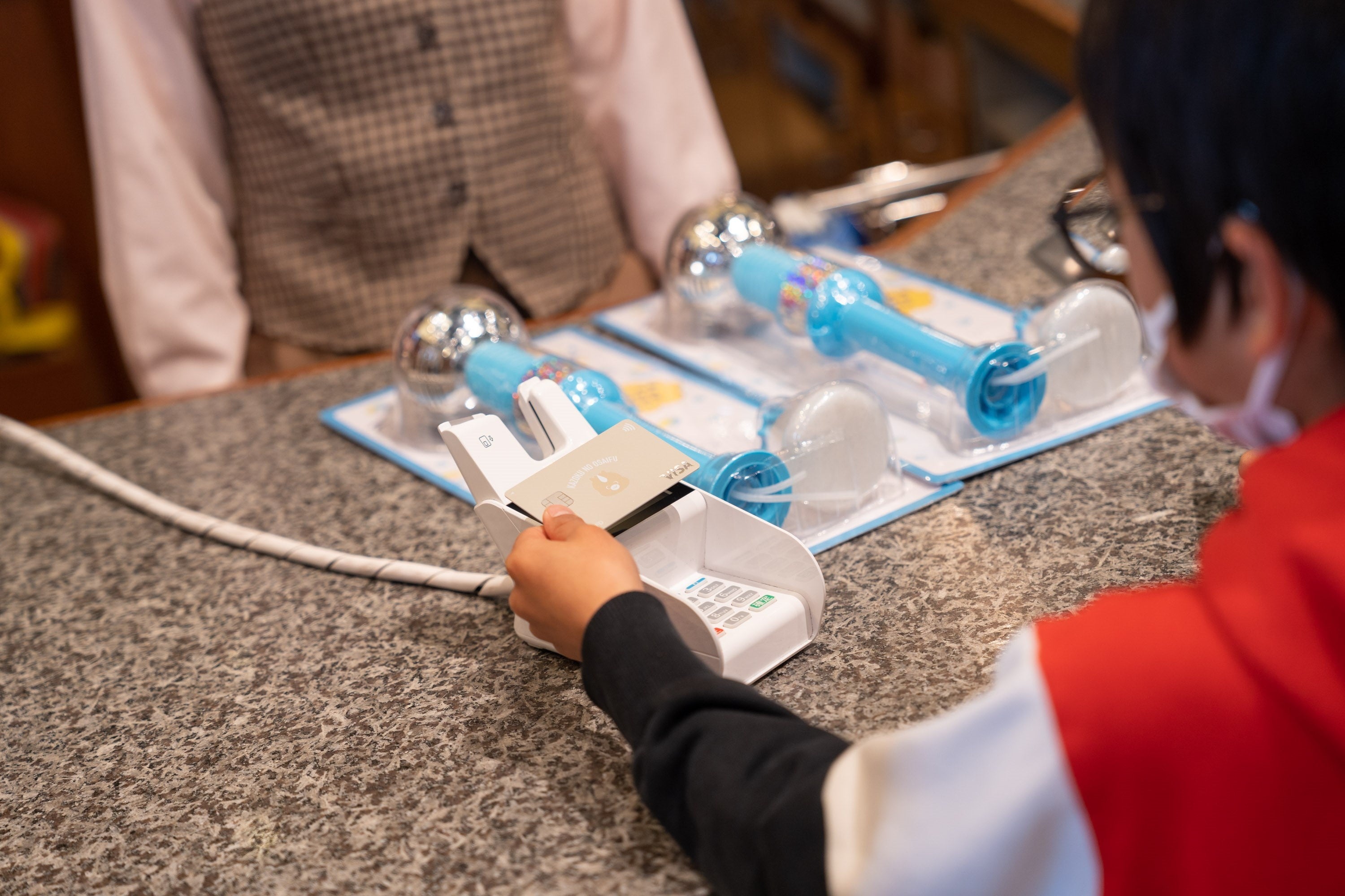 第2部では、三井住友カードの提供するVisaプリペイドカード「かぞくのおさいふ」※1を活用し、キャッシュレス化が進むパーク内を周りながら、レストランや物販店舗で実際に商品を購入し、支払いの際にはキャッシュレス決済を体験いたしました。