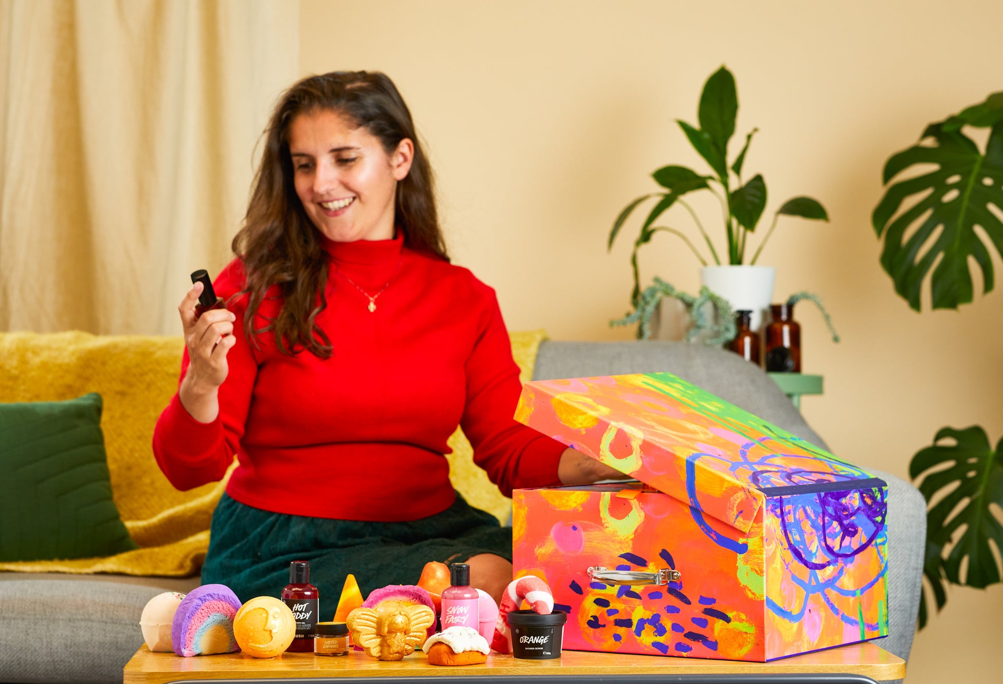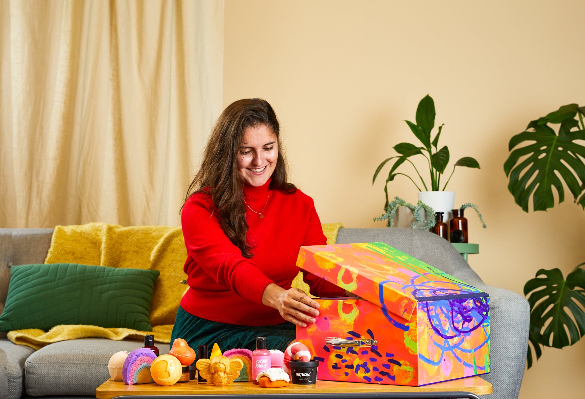 『LUSH アドベントカレンダー ギフト』のアイテムでラッシュを全身で感じたあとも、ワクワクは続きます。使い終わったボックスは、クリスマスの後もあなたの毎日をその美しいデザインと収納性でハッピーにさせてくれます。ボックスのデザインは、ラッシュの風呂敷アイテム「Knot Wrap(ノットラップ)」のデザインも手がけたイギリスに拠点を置く※社会的企業「ARTHOUSE Unlimited」に所属するアーティストがこのアドベントカレンダーのために描いたものです。見ているだけで元気が出てくるカラフルな色合いのボックスは、お気に入りのラッシュの商品を保管したり、または収納としてだけではなく、アート作品としてお部屋に飾ったり、オブジェを置くサイドテーブルにしたりなど使い方は自由自在です。
