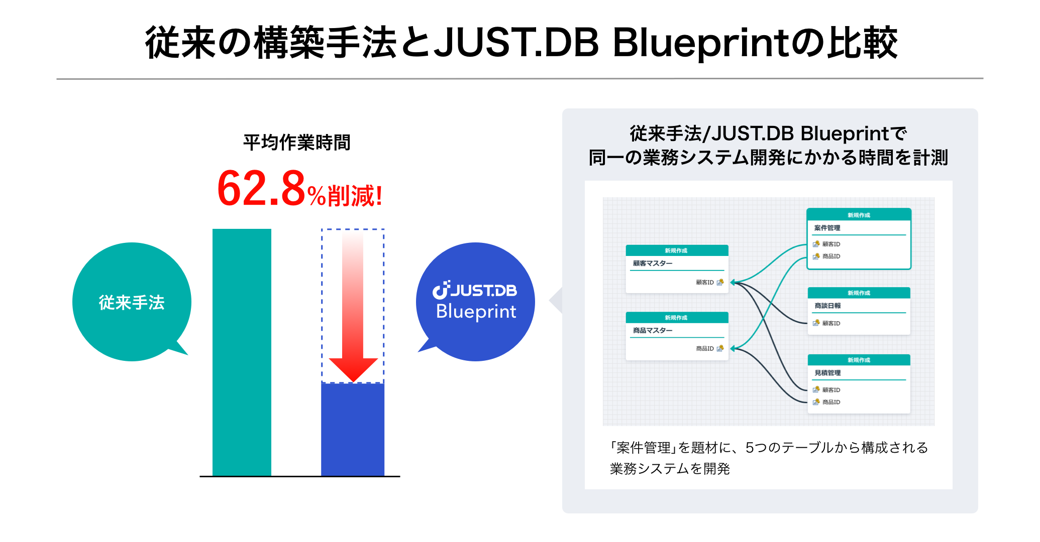 ※1 「JUST.DB Blueprint」の有無で、同一の業務システム開発にかかった作業時間の削減割合。当社調べ。