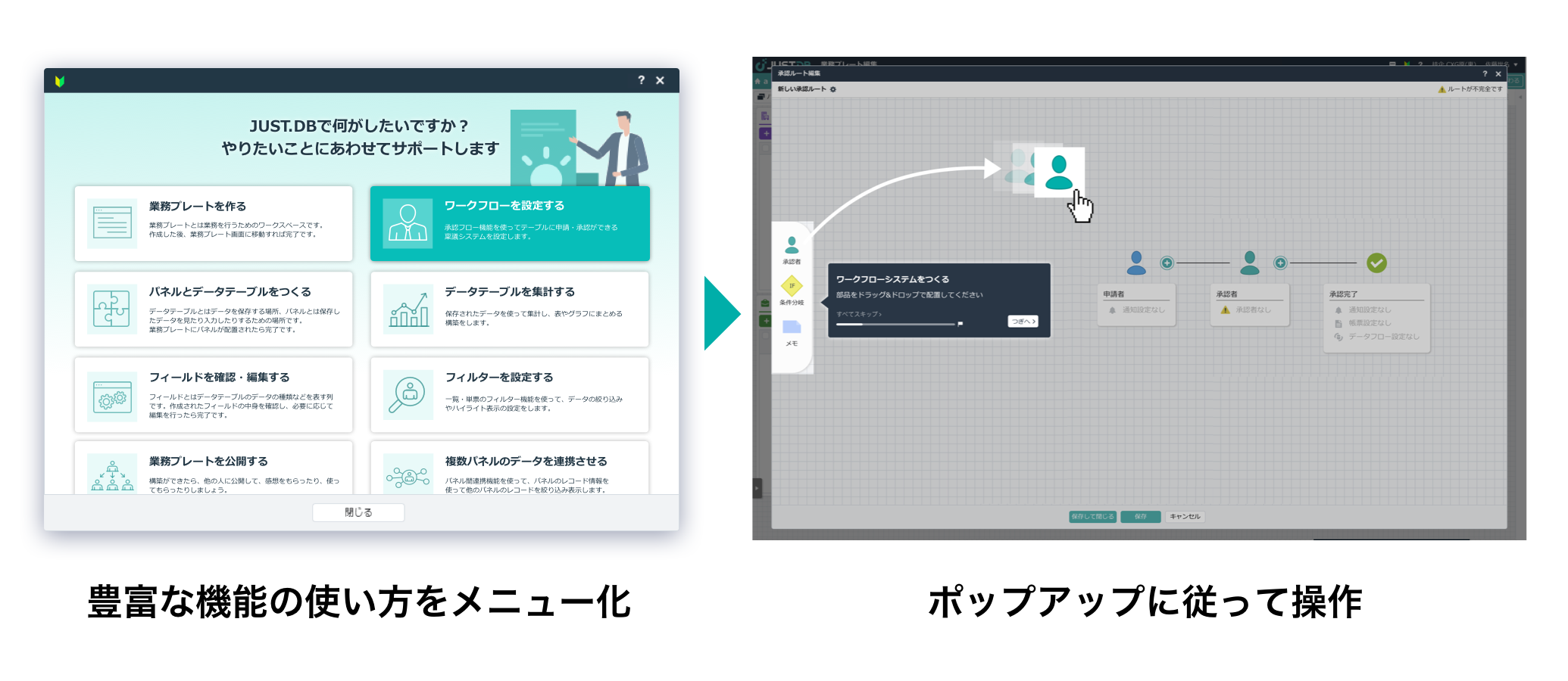 「JUST.DB」は、高い拡張性を実現するため豊富な機能を提供しています。その使い方を、実際に操作しながら習得できる「プロダクトツアー」を搭載しました。画面上に表示されるポップアップをたどっていくだけで、新しいシステム開発、アクセス権設定や集計・グラフ化、承認フローの設定など、さまざまな機能を使いこなせるようになります。