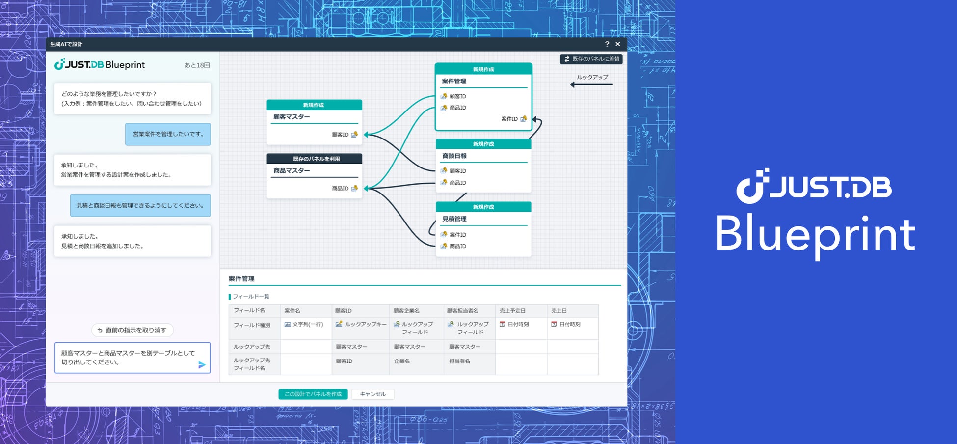 生成AIで設計不要のシステム開発を実現する「JUST.DB Blueprint」機能をノーコード クラウドデータベース「JUST.DB」に搭載し、7月23日(火)より提供開始