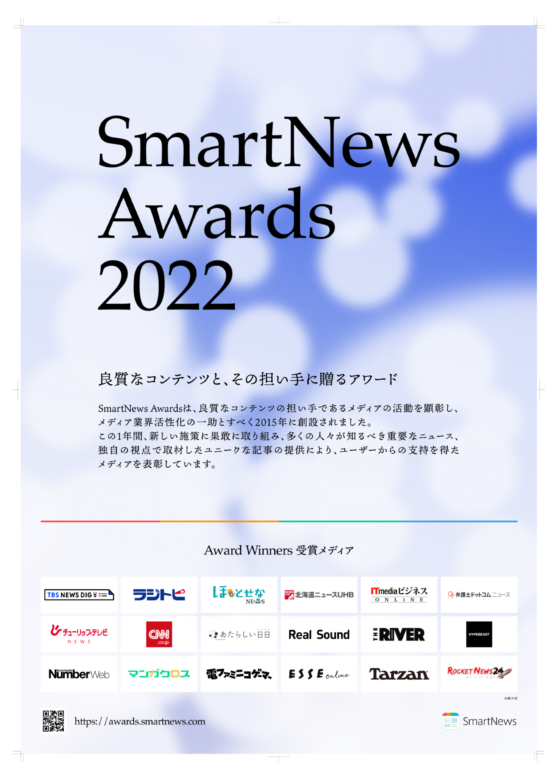 『SmartNews Awards 2022』特設サイト( https://awards.smartnews.com/ )において、「大賞」「ベストパートナー賞」「読者投票賞」の贈賞メディアを発表しました。
