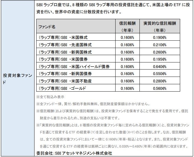 ※「実質的な信託報酬」とは、8種類の投資対象ファンド毎に定められる信託報酬(X)と、投資対象ファンドを通じて投資するETFの経費率(Y)を足し合わせた数値(X+Y)のことを指します。なお、信託報酬は、全ての投資対象ファンドにおいて一律に0.1606%(年率・税込)となります。また、投資対象ファンドを通じて投資するETFの経費率は銘柄毎に異なり、0.030%~0.480%(年率)の範囲に収まります。「実質的な信託報酬の合計額」については、8種類の投資対象ファンドの組み入れ状況によって異なりますが、最新の運用戦略を用いて運用を行った場合、その合計額は0.220%~0.394%(年率・税込)の範囲内に収まります。「実質的な信託報酬の合計額」の平均値については、2012/1/4~2021/12/30までSBIラップで運用を行ったと仮定したバックテストによって示された平均投資配分比率を基に算出したもので、その値は0.295%(年率・税込、小数点第4位切上げ)となりますが、実際の運用においては、この数値を上回る場合があります。