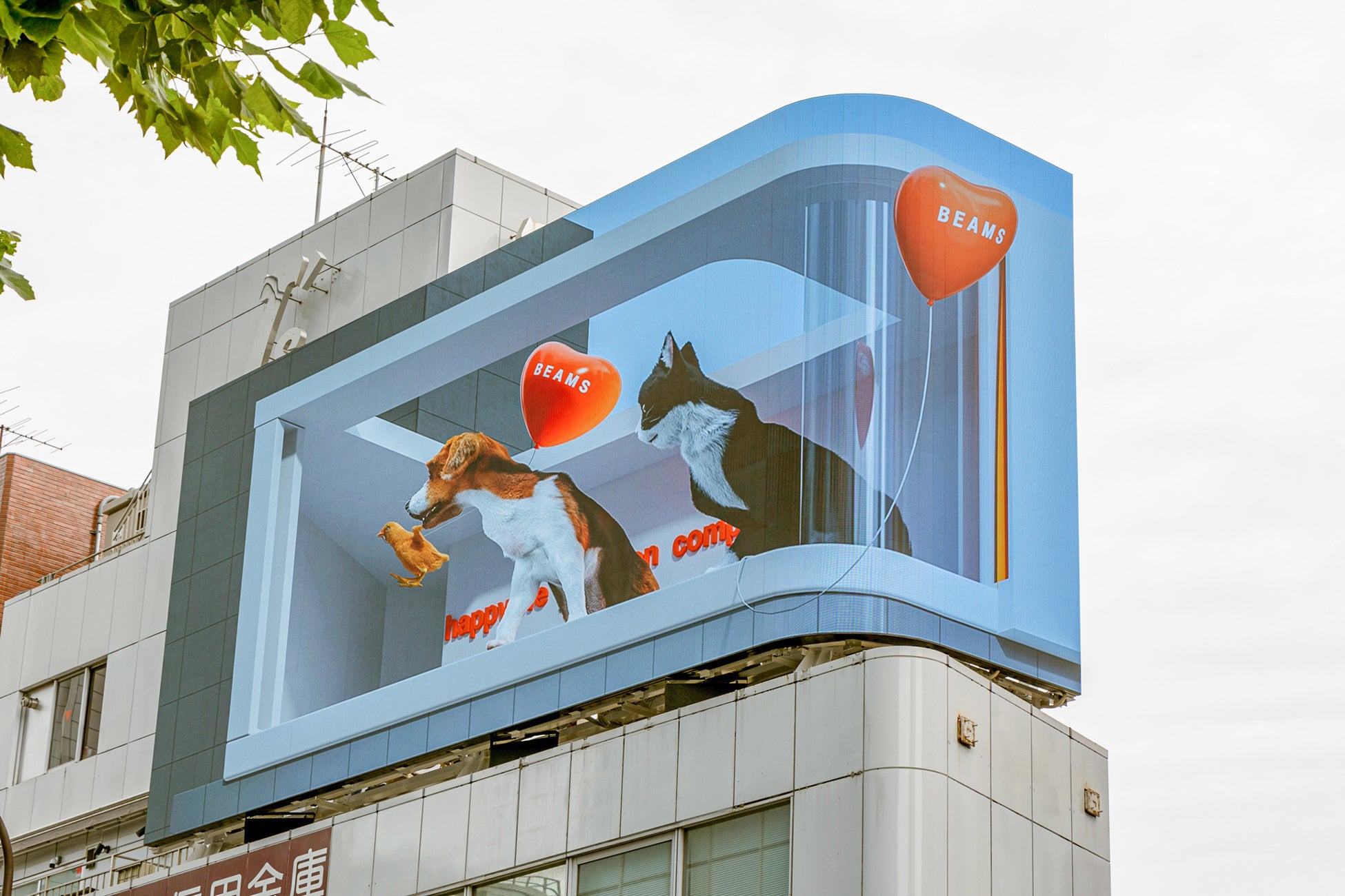 3D映像に登場する、猫、犬、ひよこ、ロバは「ブレーメンの音楽隊」がモチーフになっており、愛らしい動物たちが追いかける風船は“HAPPY”を表現しています。初めて3Dで表現されるビームスのブランドロゴにもご注目ください。世界で活躍するトップクリエイターによる最先端技術と高品質なLEDビジョンによる映像を是非お楽しみください。