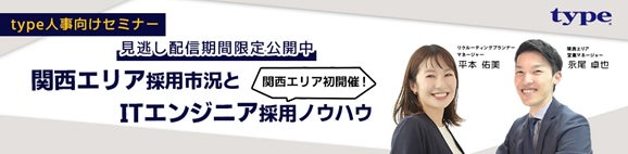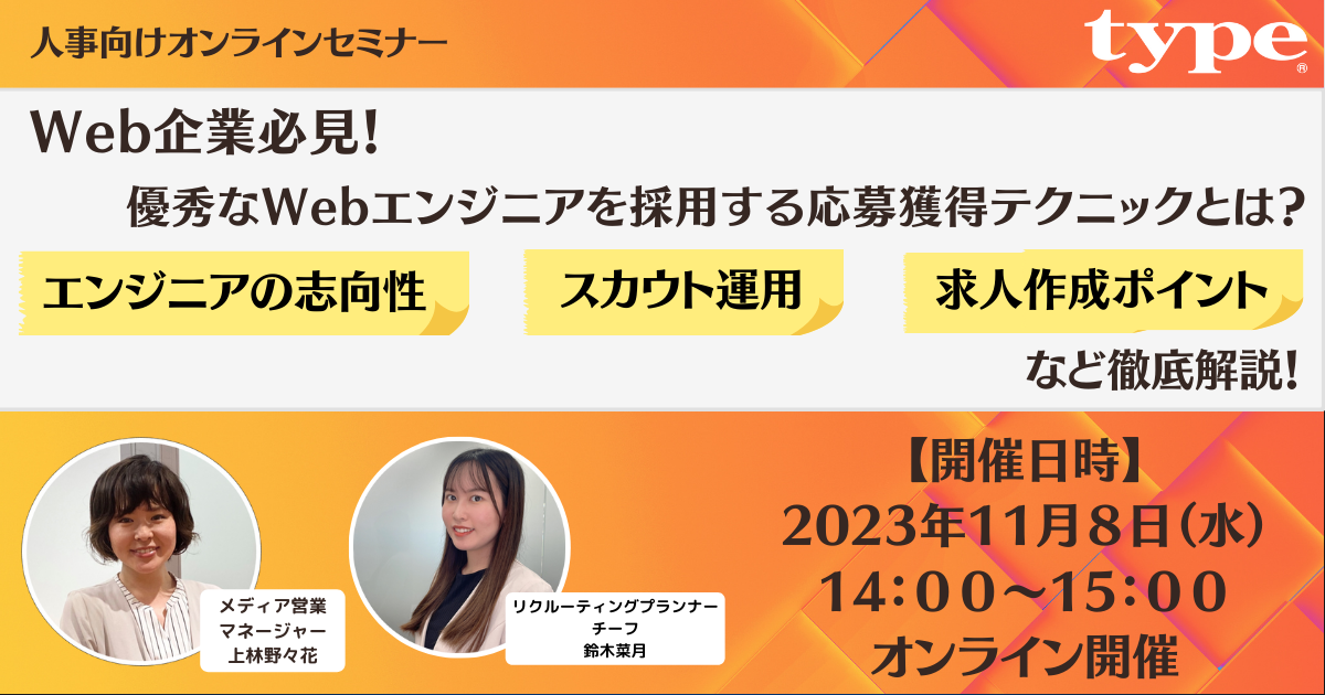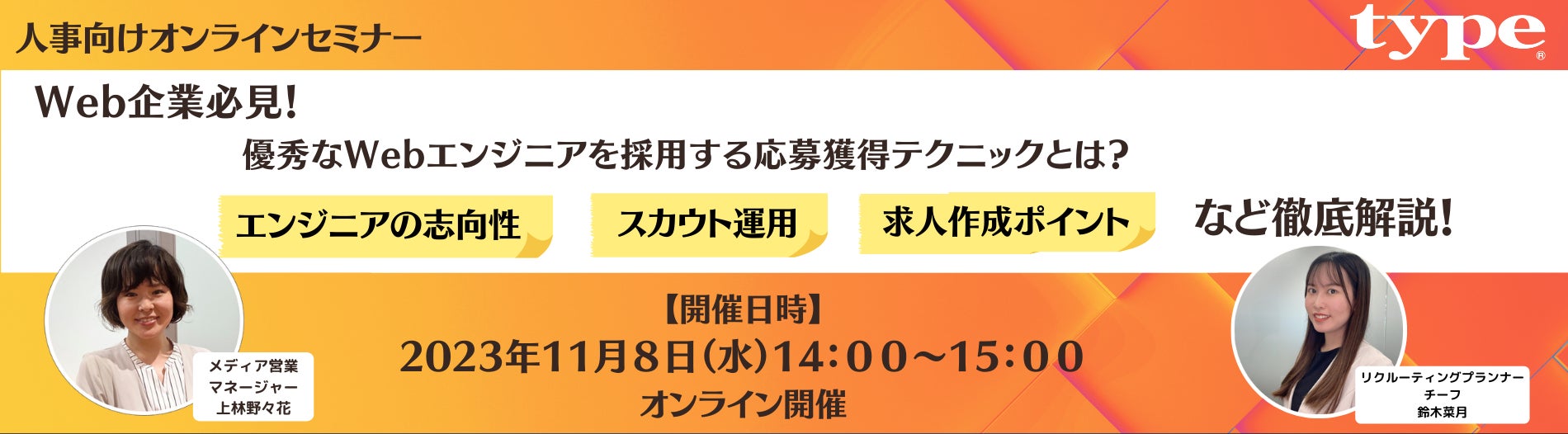 転職サイト「type」では、11/8(水)14時より「優秀なWebエンジニアを採用する応募獲得テクニックとは?~エンジニアの志向性、スカウト運用、求人作成ポイントなど徹底解説~」を開催いたします。