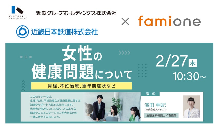 https://famione.com/benefit/ などを展開する株式会社ファミワン(本社:東京都渋谷区、代表取 締役:石川 勇介、以下当社)は、近鉄グループホールディングス株式会社(代表取締役社長:若井 敬、以下近鉄グループホールディングス)および近畿日本鉄道株式会社(代表取締役社長:原 恭、以下近畿日本鉄道)にお勤めの管理者等の各職場で総括的な役割を担っている方を対象に2025年2月27日(木) 「女性の健康問題についてー月経、不妊治療、更年期症状などー」をテーマに、現地とオンライン開催のハイブリット形式でセミナーを開催いたします。