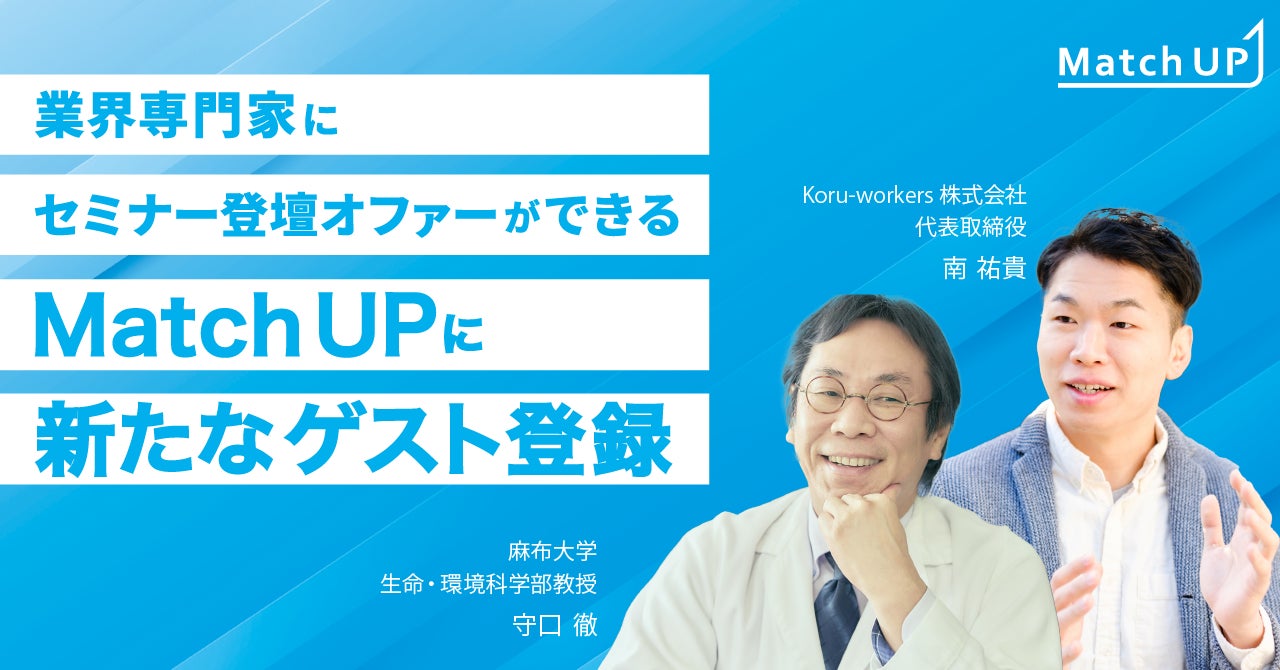 業界専門家にセミナー登壇オファーができる「Match UP」Koru-workers株式会社 南 祐貴氏、麻布大学 守口 徹氏が新たにゲスト登録