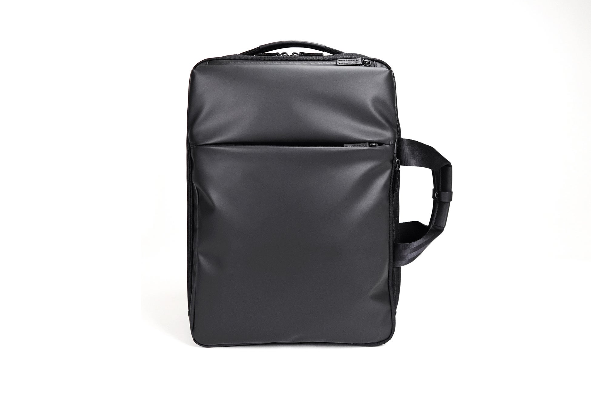 周囲だけでなく着用者にも邪魔になりにくい薄マチ形状ながら、書類やノートPCなどの荷物が効率良く入る無駄のないスクエア型で、容量をしっかり確保しています。