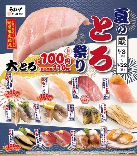 この夏かっぱ寿司では人気の豪華ネタを、期間および店内飲食限定でお手頃価格の110円(税込)でご提供しております。続く2022年8月3日(水)~8月12日(金)の期間は『大とろ』が一貫110円(税込)で登場します!