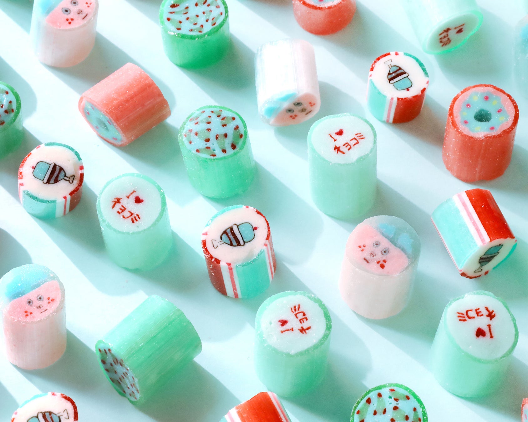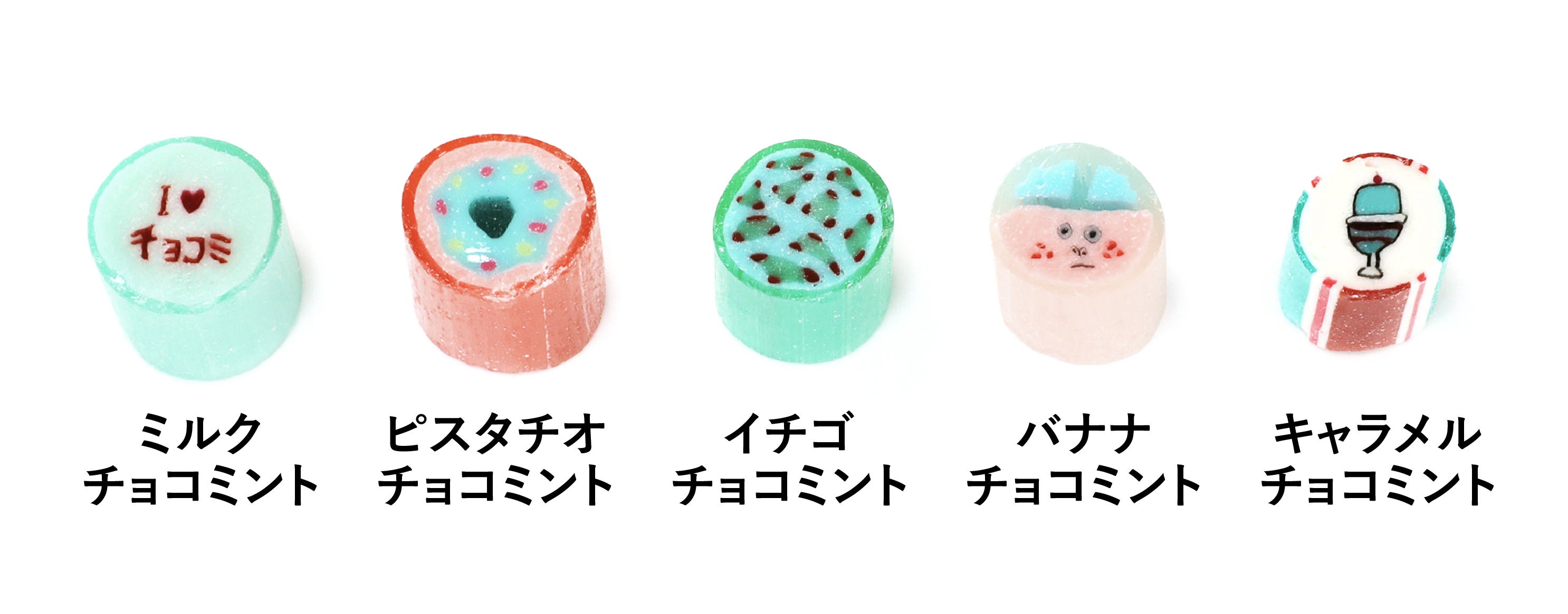 今年のチョコミントミックスは、アイスクリームショップやレトロなダイナーメニューを思わせる世界観の中で、ドーナツやパフェといったポップなスイーツモチーフをキャンディの中に描き出しました。