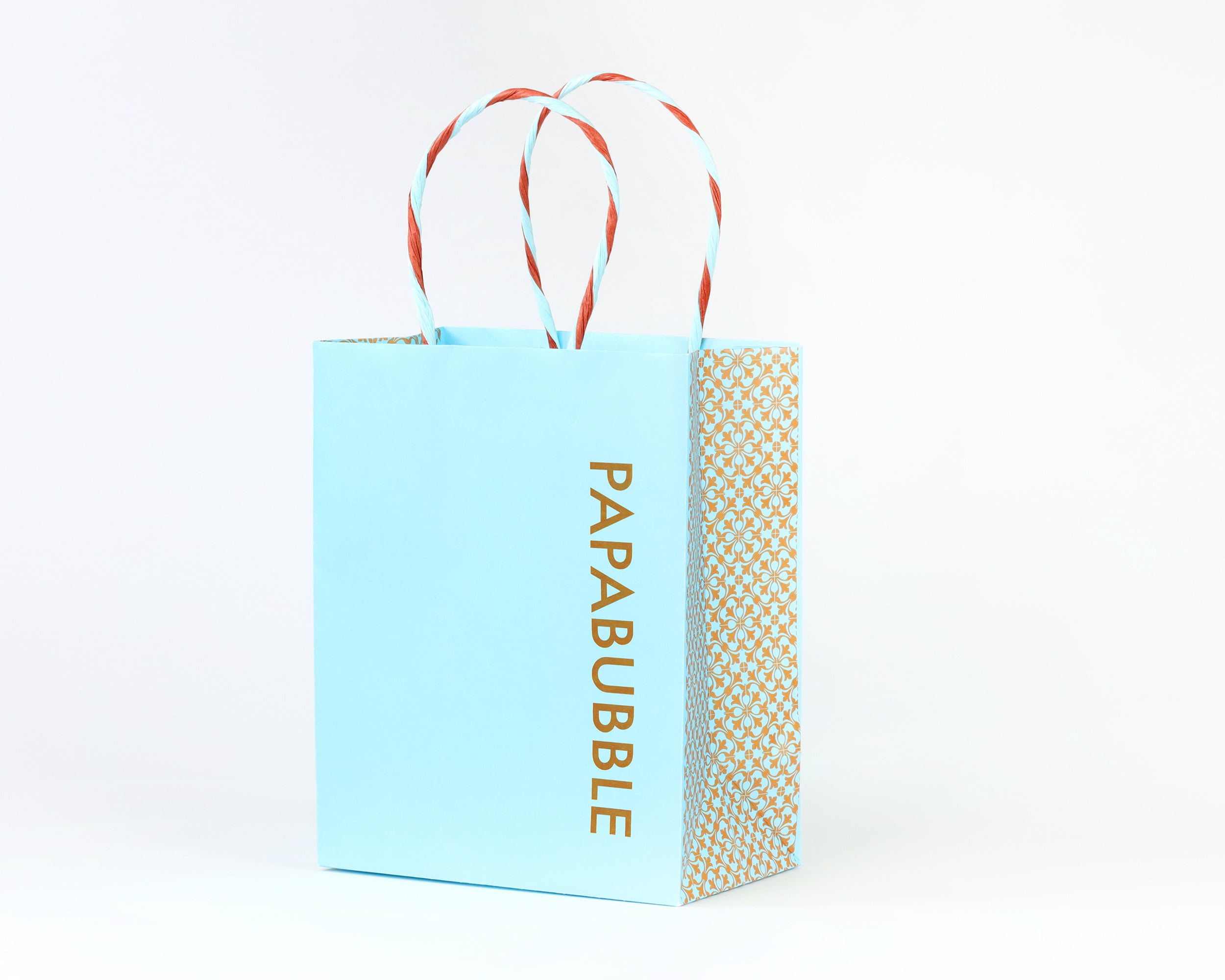 ミントブルーとチョコレートカラーを基調に、爽やかさと遊び心を感じるデザインに仕上げています。持ち手にはキャンディの縞模様をイメージしたストライプをあしらい、アクセントを加えました。