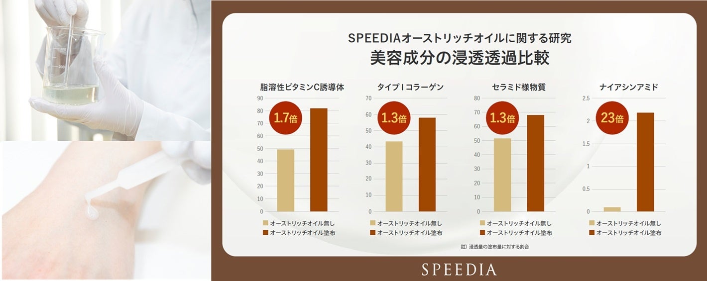 オーストリッチオイルの塗布の有無で美容成分の浸透具合を比較すると、脂溶性ビタミンC誘導体は1.7倍、タイプⅠコラーゲンとセラミド様物質は1.3倍の吸収量の差があった。