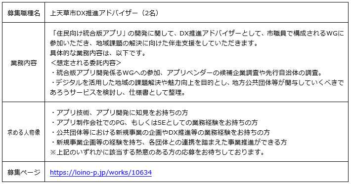 転職サービス「doda」などを提供するパーソルキャリア株式会社が運営する、地方特化型副業マッチングプラットフォーム「Loino」は、熊本県上天草市(市長 堀江 隆臣)の行政サービスのデジタル化を推進するDX推進アドバイザーを全国から2名募集することになりましたので、お知らせいたします。