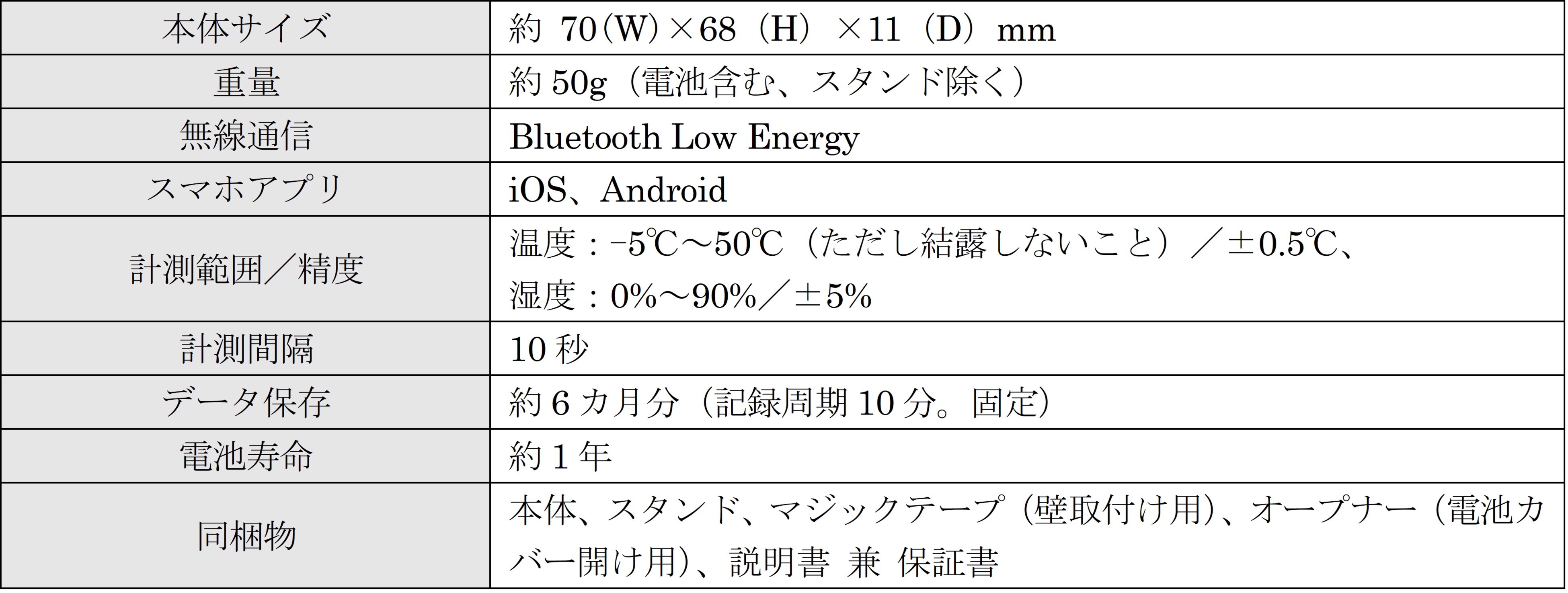 「スマート温湿度計」は、Bluetooth®対応の「デジタル時計付き温湿度計」です。液晶画面には、「温度」「湿度」「時刻」を大きく表示し、部屋の状態をリアルタイムで把握することができます。計測した数値は 10分単位で自動保存され、専用のスマホアプリから数値やグラフを確認することができます。