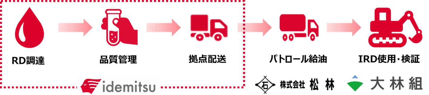 出光興産は、欧州EN規格(EN15940:2016)※ 1に適合したリニューアブルディーゼル(以下「RD」)を海外から調達し、独自の規格および品質を担保した商品「IRD」として販売します。RDは既存の流通インフラの活用や内燃機関で使用できるため、運輸業界や建設業界での普及が期待されています。本実証では、大林組が施工する建設現場において、建設機械(油圧ショベル)に、軽油代替燃料として「IRD」を使用します。「IRD」は、松林のネットワークを通じて使用現場まで配送され、パトロール給油※ 2されます。本実証を通じ3 社は、「IRD」の使用が建設機械に及ぼす影響を調査するとともに、燃料の調達から供給、運用、メンテナンスまでのプロセスを総合的に検証します。