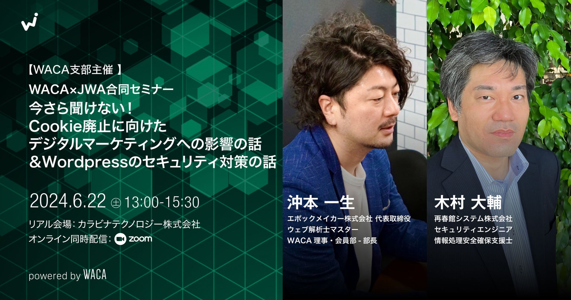 2024/6/22(土)13:00〜15:30 WACA×JWA合同セミナー 今さら聞けない!Cookie廃止に向けたデジタルマーケティングへの影響の話&WordPressのセキュリティ対策の話