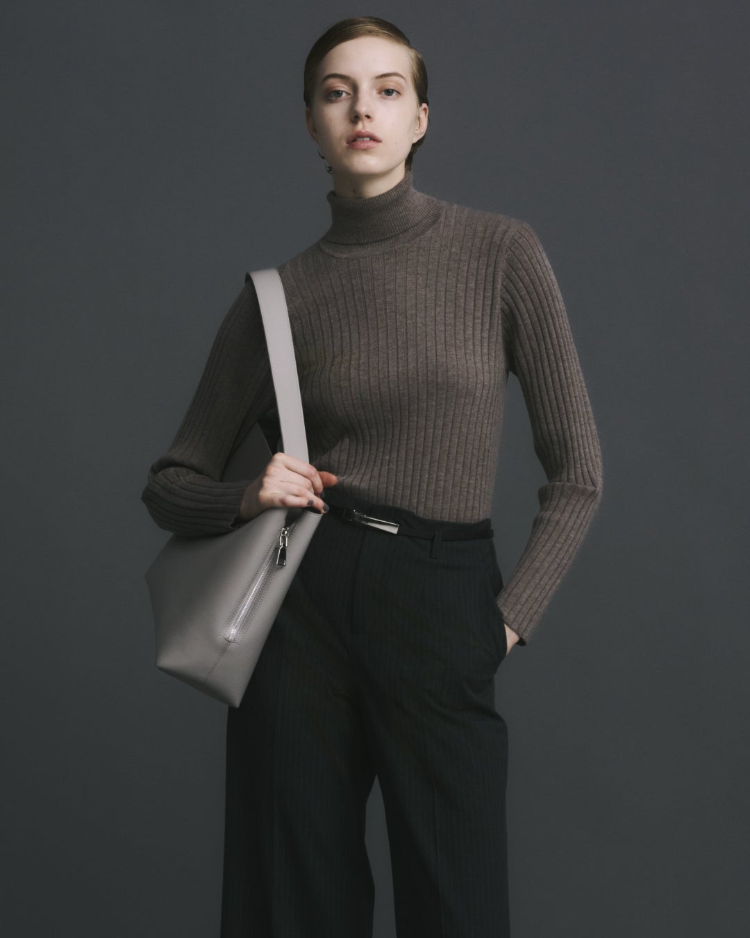 ④ ワイドリブタートルネックニット、シンプルで着回しやすくボディラインに程良くフィットするサイズ感と肉感がポイント。衿を折り返してきちんと感のある着こなし、おらずにくしゅっとルーズにさせてこなれ感のある着こなしの両方が楽しめる仕様