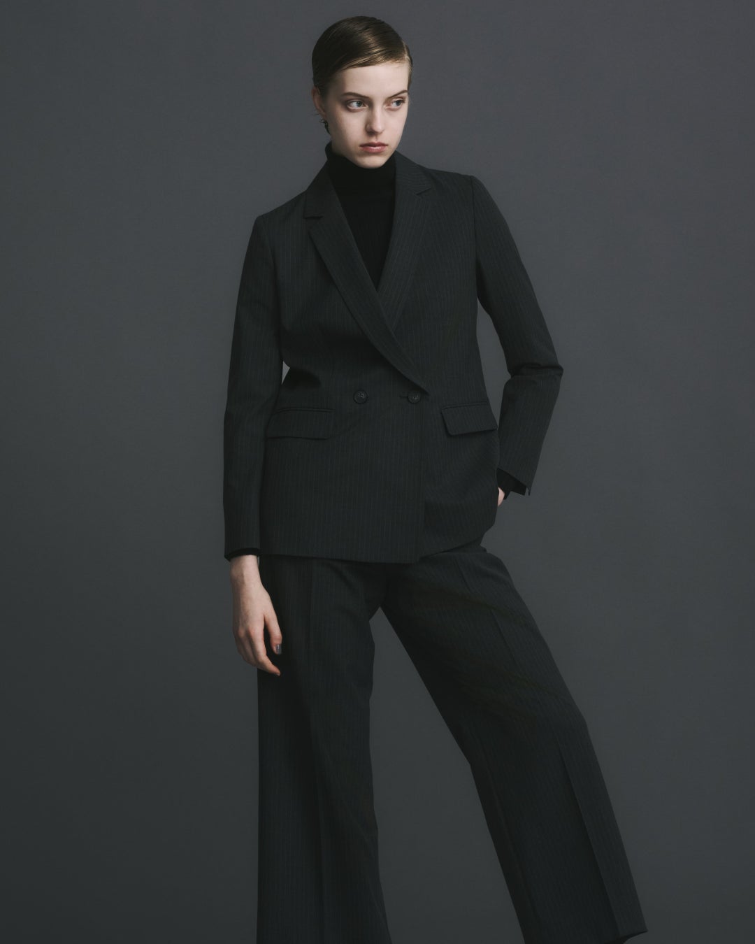 ② 適度なコントラストがポイントのチョークストライプ柄で、スタイリングしやすいベーシックさの中にシャープな印象をプラス。
