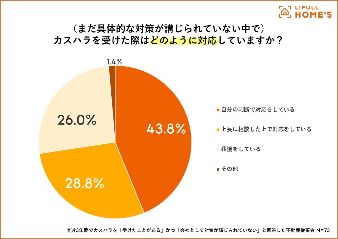 直近3年間でカスハラを「受けたことがある」かつ「会社として対策が講じられていない」と回答した人に対し、カスハラを受けた際の対応について聞いたところ、過半数近い43.8%が「自分の判断で対応をしている」と回答しました。さらに26.0%は「我慢をしている」としており、属人的な対応となってしまっている様子がうかがえました。