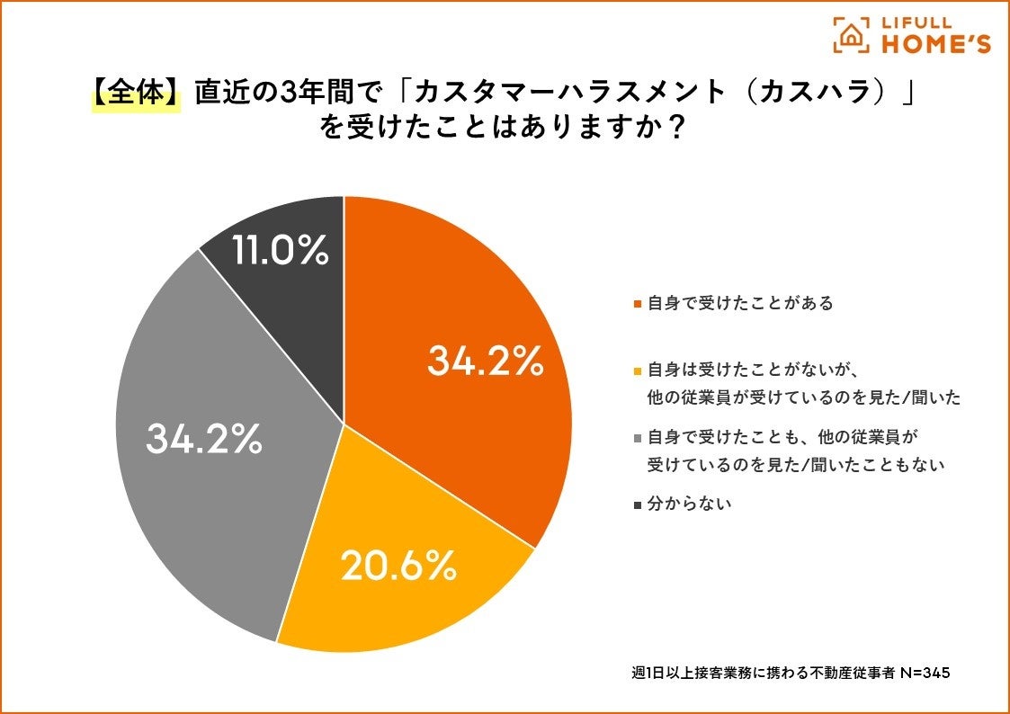 事業を通して社会課題解決に取り組む株式会社LIFULL(ライフル)(本社:東京都千代田区、代表取締役社長:伊東祐司、東証プライム:2120)が運営する不動産・住宅情報サービス「LIFULL HOME'S(ライフルホームズ)」は、昨今社会問題化している「カスハラ(カスタマーハラスメント)」の実態について不動産業務従事者370名を対象に調査を行いました。