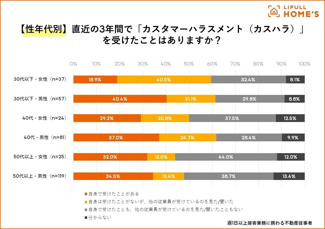 直近の3年間でカスハラを経験したのは3人に1人。性年代別では30代以下の男性の被害が多い結果に