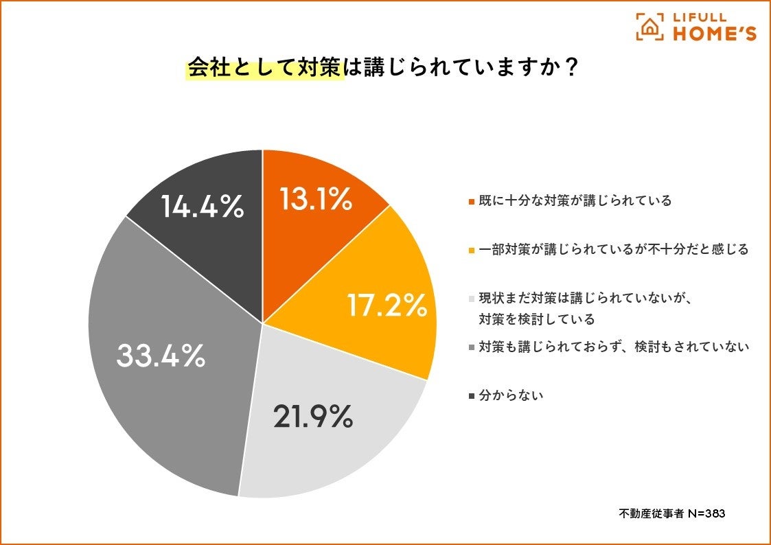 会社として対策が講じられているかどうかについて聞いたところ、「既に十分な対策が講じられている」と回答したのは13.1%となりました。「対策は講じられていない」は過半数となり、さらにそのうちの33.4%は「検討もされていない」と回答しており、不動産会社の対応はまだまだ追いついていないのが現状のようです。