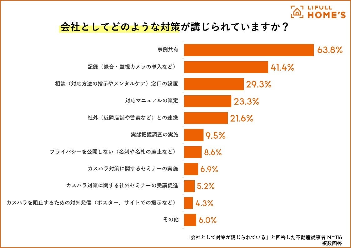 「会社として対策が講じられている」と回答した人に対し、具体的な内容を聞いたところ、「事例共有」(63.8%)のみが半数を超え、その後に「記録(録音・監視カメラの導入など)」(41.4%)、「相談(対応方法の指示やメンタルケア)窓口の設置」(29.3%)が続きました。