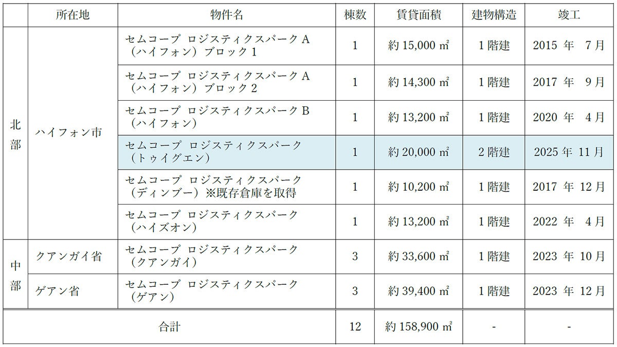 本物件の竣工により、ベトナムにおいて竣工済の物流不動産は、北部ハイフォン市内の6棟と中部の6棟(クアンガイ省内及びゲアン省内の各3棟)を合わせて計12棟・総賃貸面積約16万平方メートル(※2)となります。