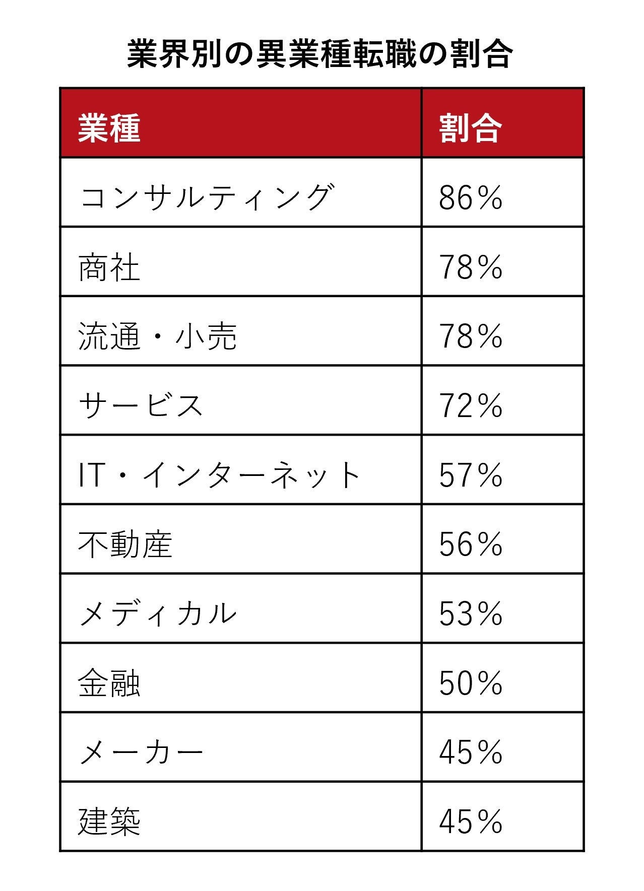 ・直近1年で異業種転職の割合が増加した業界は、「コンサルティング」「商社」「流通・小売」など