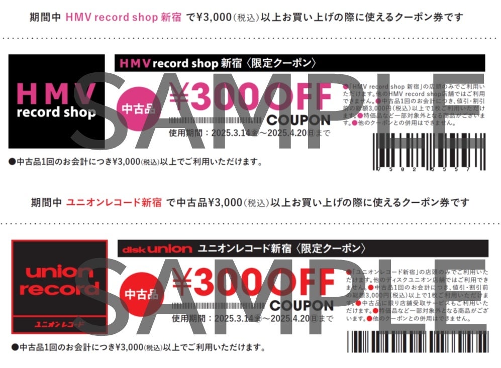 「HMV record shop 新宿」では「ユニオンレコード新宿」で使えるクーポンを、「ユニオンレコード新宿」では「HMV record shop 新宿」で使えるクーポンを配布いたします。