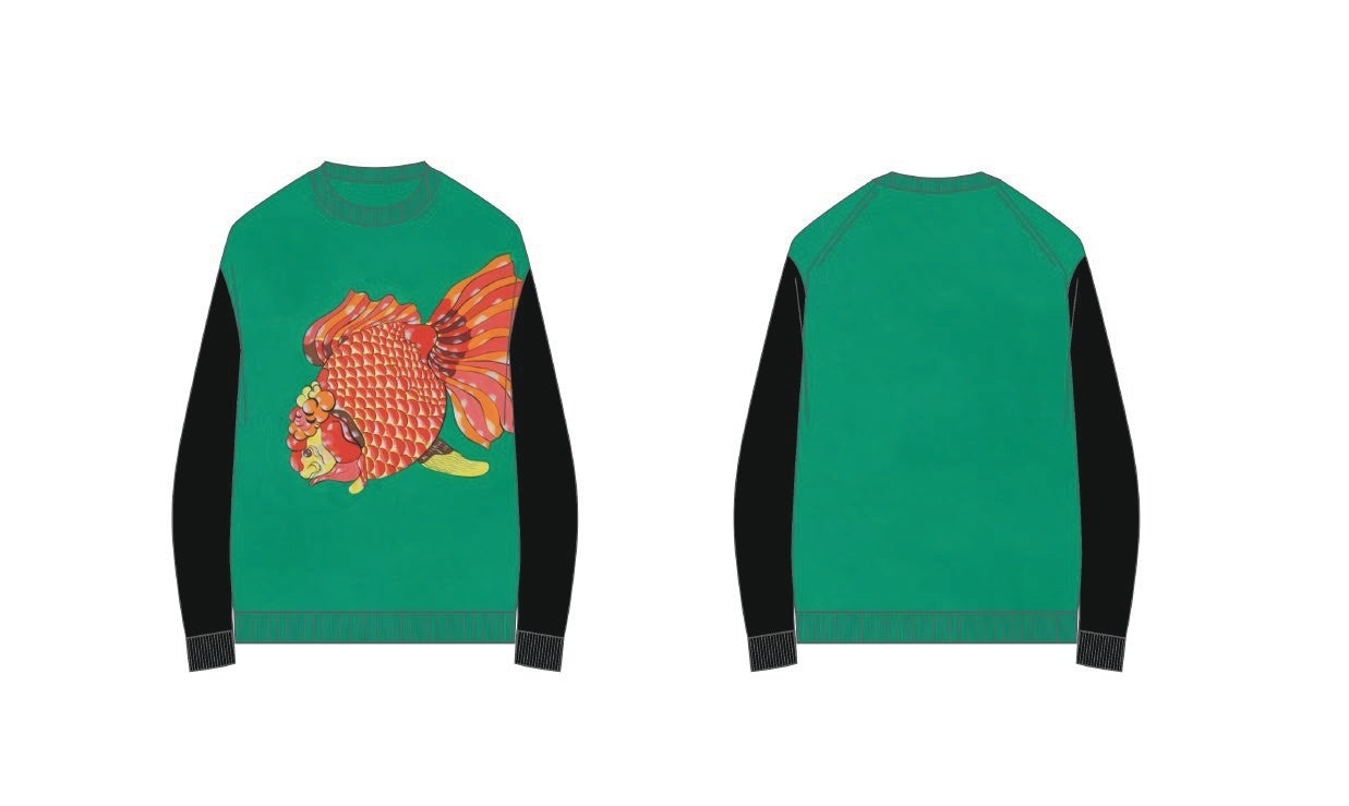 前回のコラボレーションでシャツにプリントした金魚のグラフィックを今回はニットに落とし込みました。