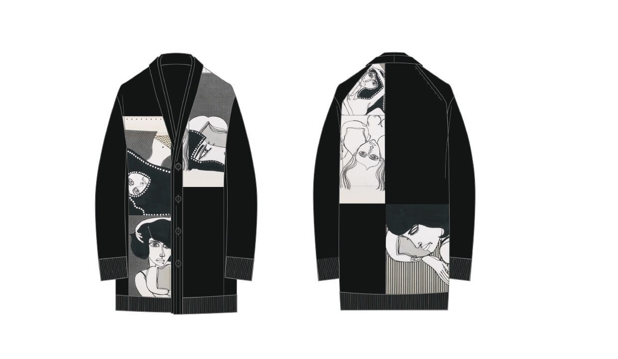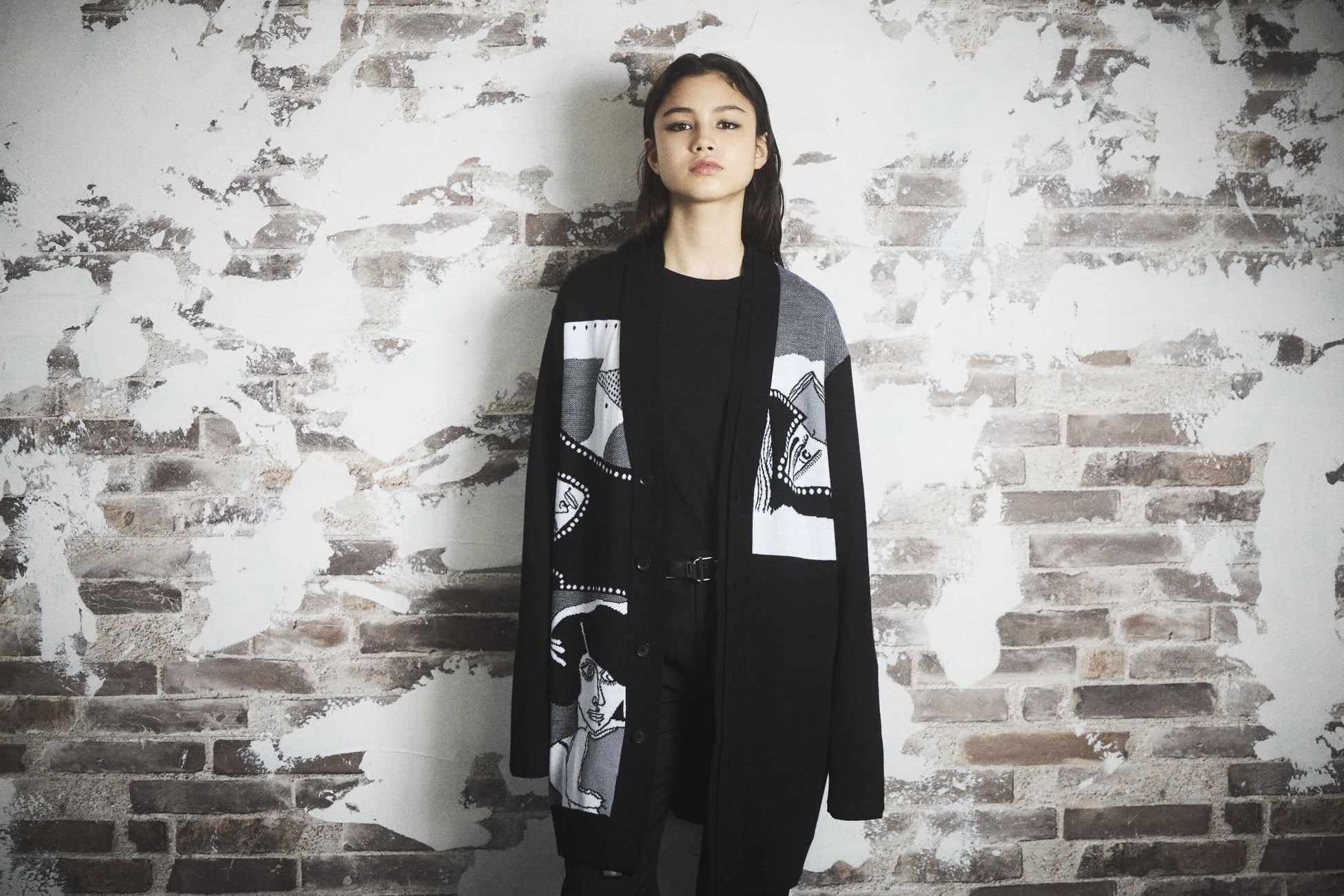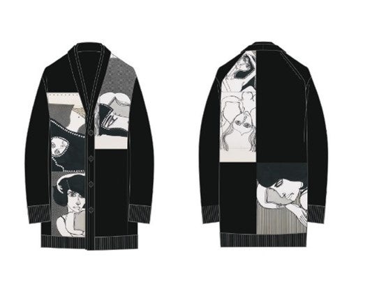 ニットカーディガンは田名網氏が1966年に発刊したヴィジュアルブックの『田名網敬一の肖像』より抜き出した女性たちのイラストレーションを前面、背面にランダムに配して田名網氏の作品を活かしながらGround Yらしいゆったりとしたシルエットで製作いたしました。