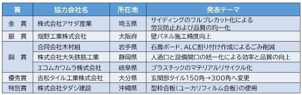 本アワードは、大東建託協力会に所属する施工協力会社(20,049社)から生産性向上につながる改善アイデアを公募し、優秀事例を表彰するもので、今回が初めての開催となります。全国大会では、応募総数264件のうち、地方大会を通過した12件が発表され、株式会社アサダ産業のアイデア「サイディングのフルプレカット化による労災防止および品質の均一化」が金賞に選ばれました。そのほかにも、施工の品質や効率向上、産業廃棄物の削減などにつながるアイデアがそれぞれ入選しています。