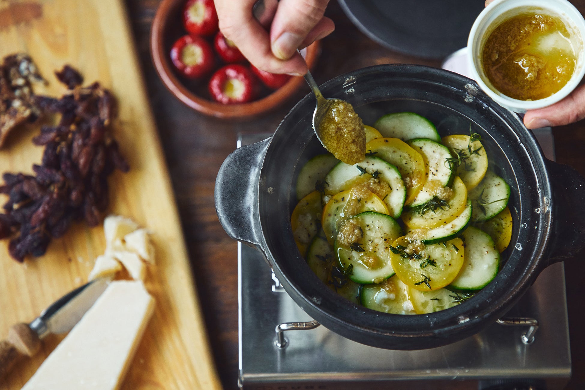 また今回はこの土鍋の魅力を存分にお伝えするため、特別なオンラインイベントを開催。第一部はDEAN & DELUCAの多彩なレシピを生み出し続けている境哲也シェフから土鍋をつかった料理教室を、第二部は、陶芸家の吉田直嗣氏、器のディレクションをしてくださった祥見知生氏をお招きし、秋の夜長にうつわをたのしむトークショーを開催いたします。