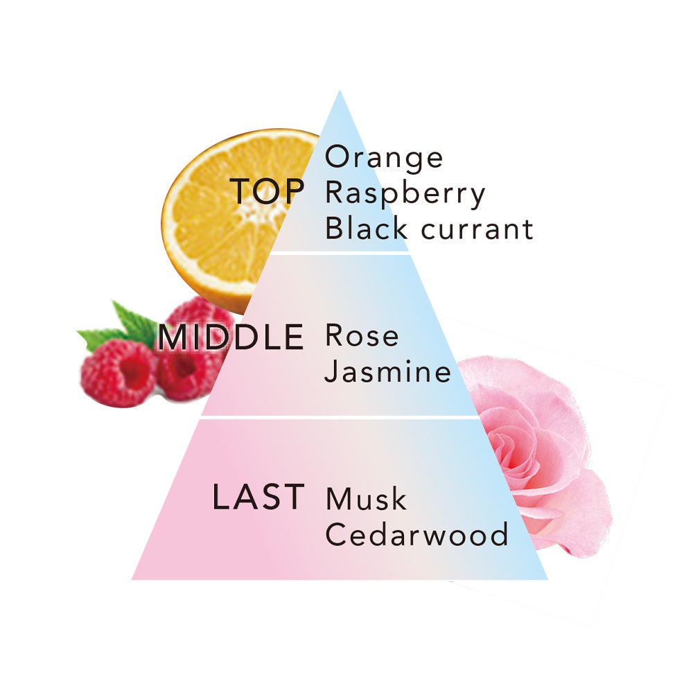 上品なローズ、ジャスミンにジューシーなベリー、カシスをアクセントに添えた、ときめくようなフローラルフルーティーの香りです。