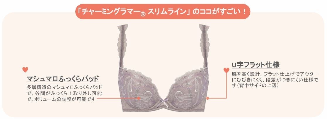 脇を高く設計し、U字フラット仕上げで脇や背中の段差がおさえられ、アウターをすっきり着こなせます。多層構造のマシュマロふっくらパッドで、谷間もふっくら。360度パーフェクトなシルエットを叶えます。パッドは取り外しできるので、お好みでボリュームの調整可能です。