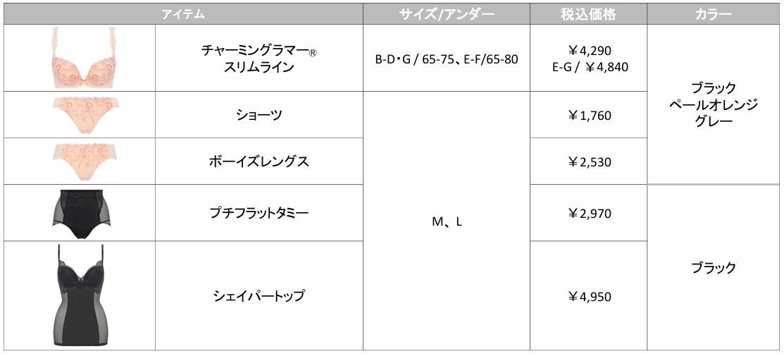 流れるようなラインがロマンティックなリボンモチーフのエンブロイダリーレースと、アーチ状のスカラが繊細な編みレースを組み合わせたレーシーなデザインの<Witch girl>。今回は、人気フィット「チャーミングラマーⓇ スリムライン」に加え、「シェイパートップ」と「プチフラットタミー」の2つのスタイルメイクアイテムもエントリーしました。ゴシックのムード満点のブラック、グレー、ほんのり甘いペールオレンジの3色展開です。