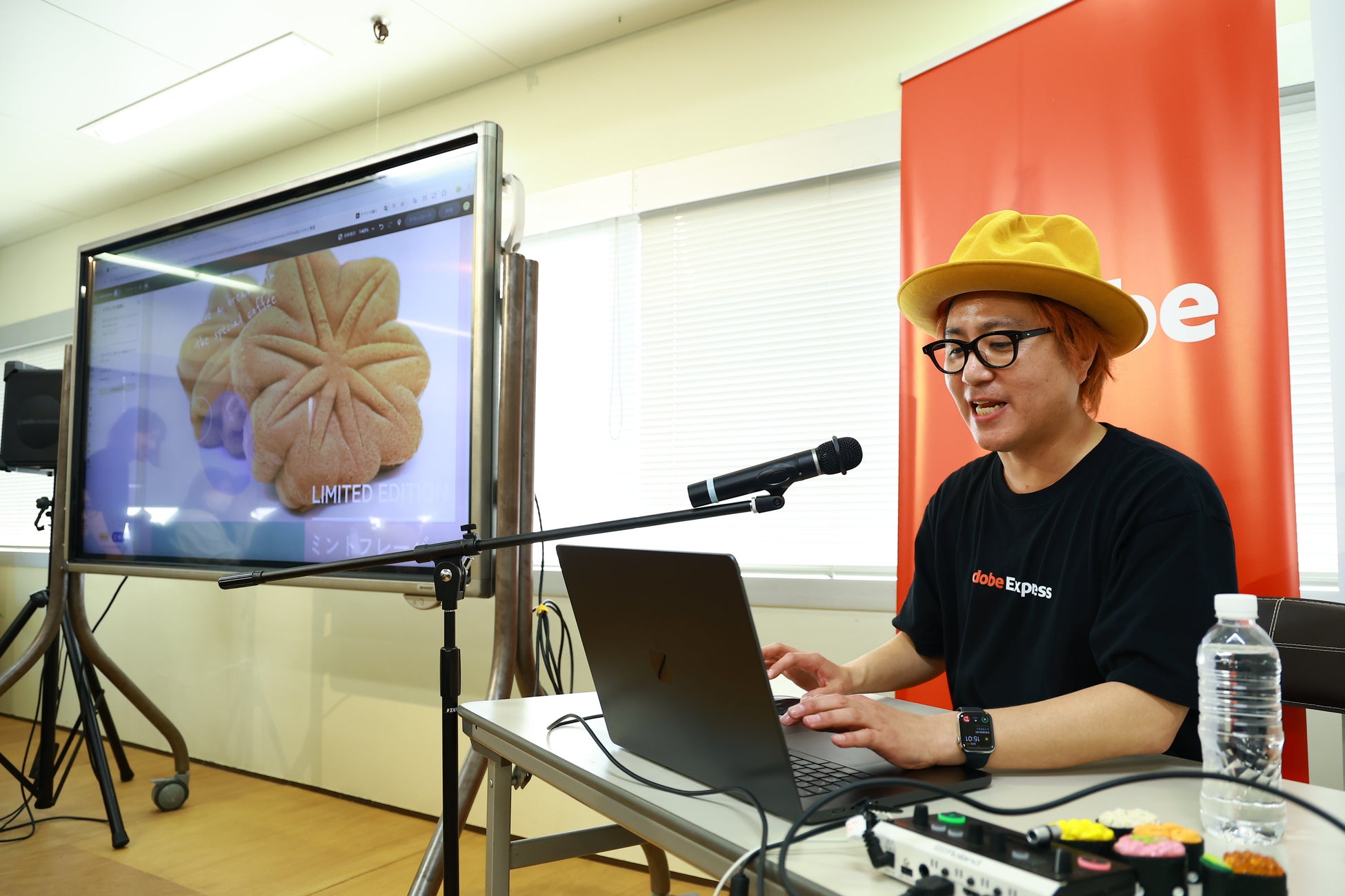 クリエイティブプロデューサー/デザイナーの久保田 涼子氏とイラストレーター/キャラクターデザイナーの北沢 直樹氏を招いた本ワークショップは、Adobe Expressの基本操作のレクチャーからスタートしました。Adobe Expressでは様々なデザインテンプレートが利用できるため、新しいメニュー表やポップなどの作成はもちろん、SNS画像の作成など、昨今求められるソーシャルメディアでの発信にも役立つ素材が豊富に揃っています。