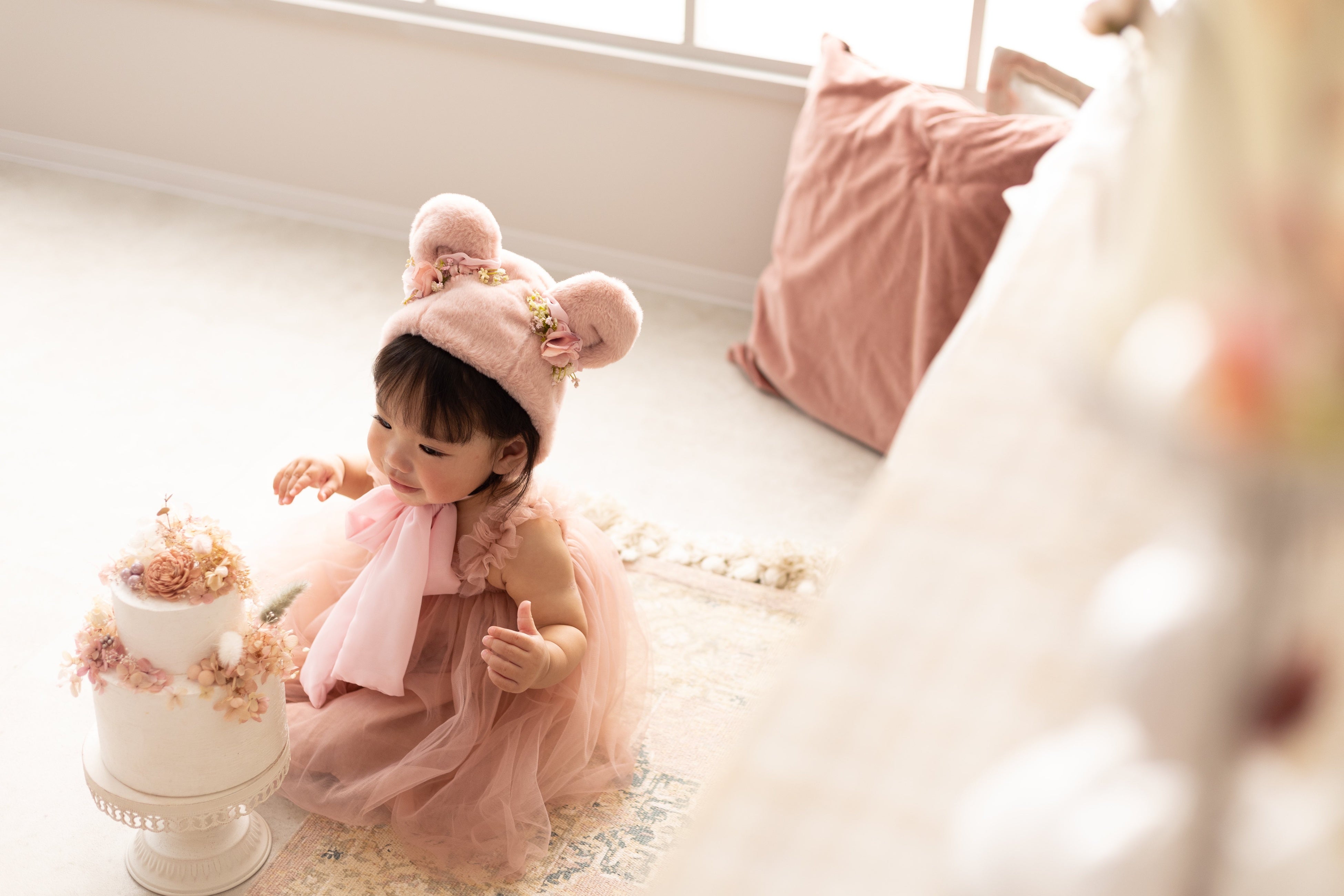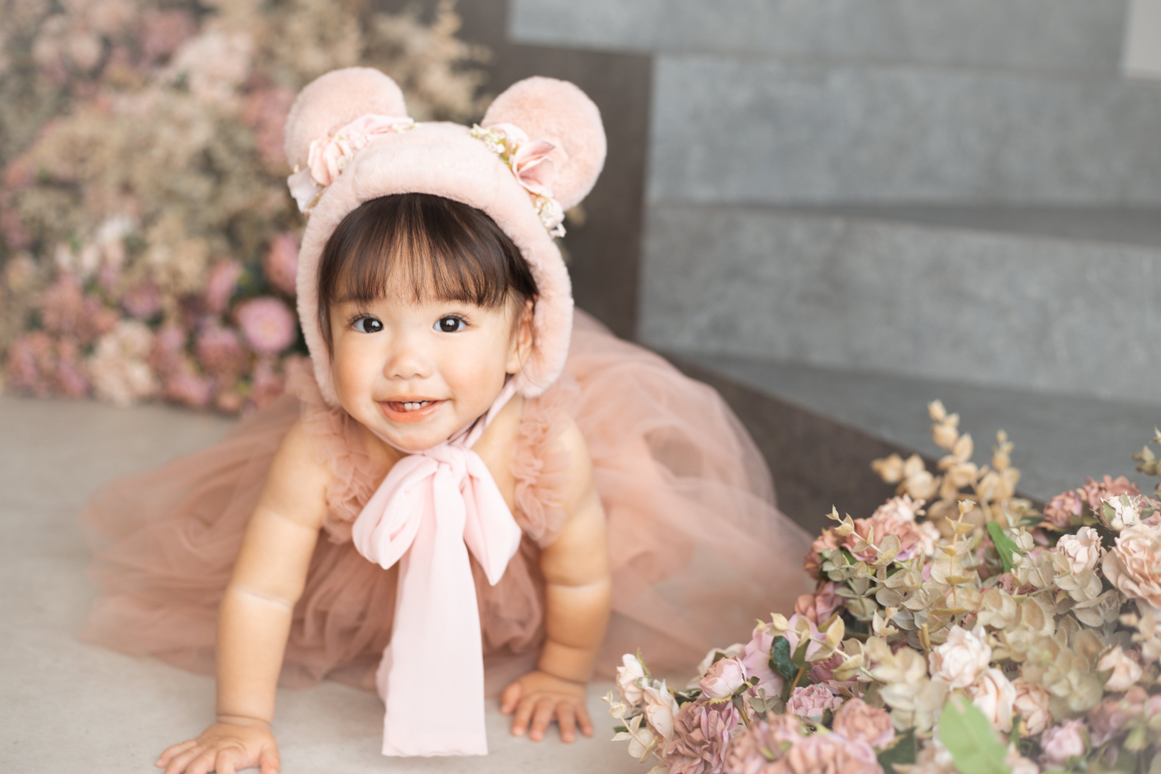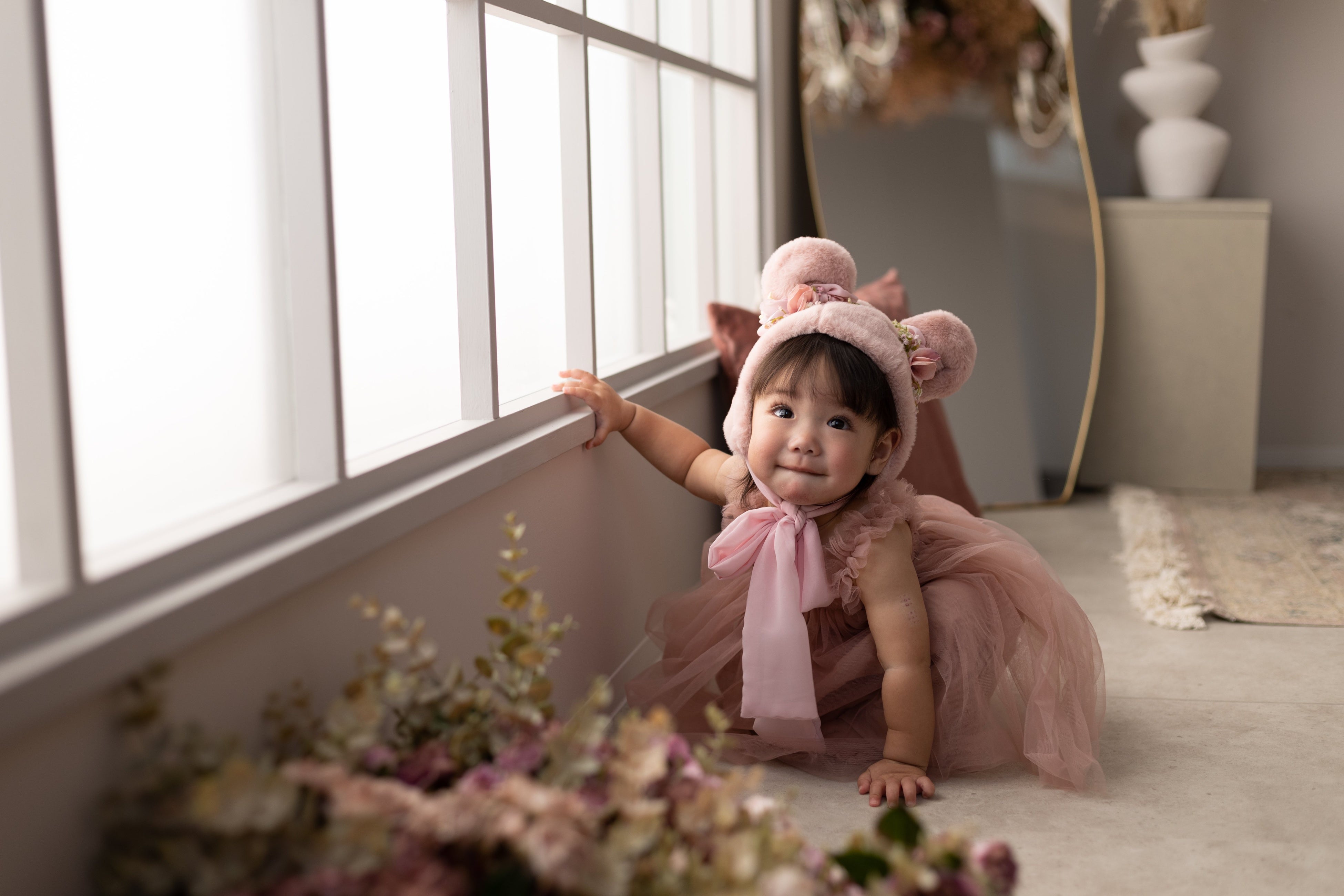 "はないろstudio"は大きな窓と階段を構え、天井から床まで花に囲まれた人気のスタジオです。今回、明るい光といっぱいの花に囲まれた空間と柔らかな空間にぴったりな衣装、なりきりベビーpinkbearを掛け合わせたビジュアルを作りました。