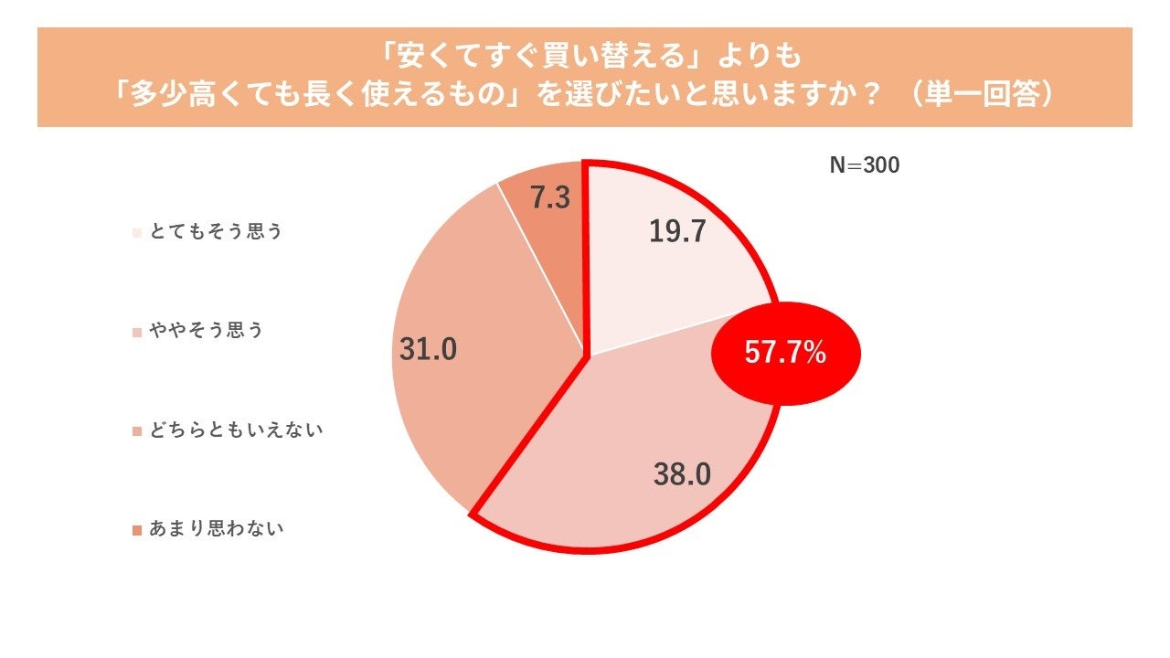 また、「安くてすぐ買い替えるものよりも、多少高くても長く使えるものを選びたいか」という問いに対して、57.7%の人が『そう思う』と回答(図7参照)。これにより、生活者の間では確実に、安さや便利さから、長く使える価値へのシフトしていることがわかりました。