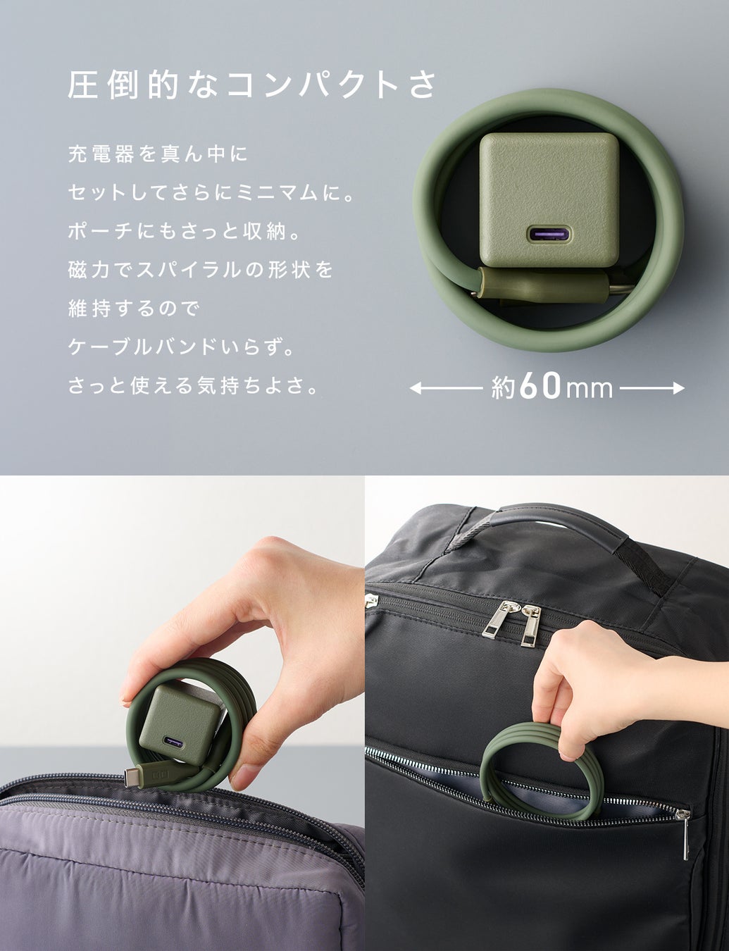 また、CIOでは使用シーンにおける最適な使い方として、マグネットの力でまとまる『CIO スパイラルケーブル/スパイラルシリコンケーブル』との組み合わせをご提案。純正充電器と同程度の体積でUSBケーブルまで持ち運べます。「かさばる!」というご不満をCIOの総合力でさらに改善します。