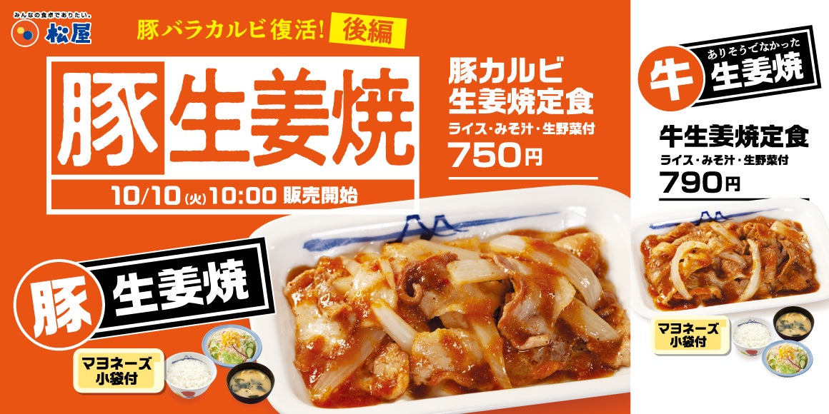 前編の「豚カルビ焼肉定食」に続く後編では「豚カルビ生姜焼定食」が登場さらに、ありそうでなかった「牛生姜焼定食」を新発売!10月10日(火)午前10時~販売開始