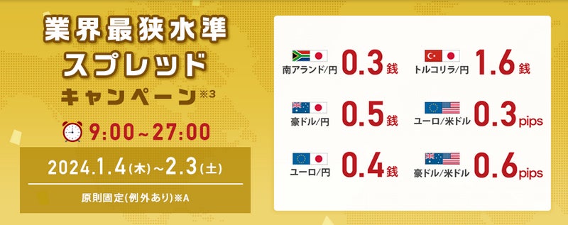 ※3 「業界最狭水準スプレッドキャンペーン」スプレッド(対象期間:2024年1月4日(木)午前9時00分~2024年2月3日(土)午前3時00分 、提示時間帯:対象期間中の各営業日午前9時~翌午前3時)