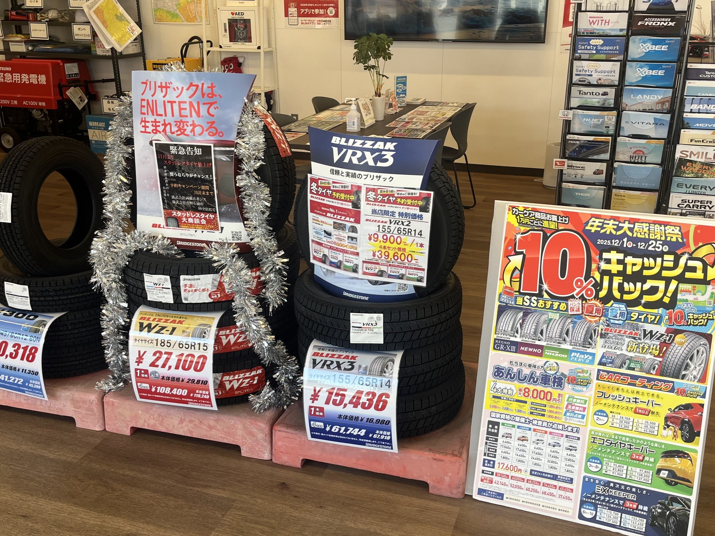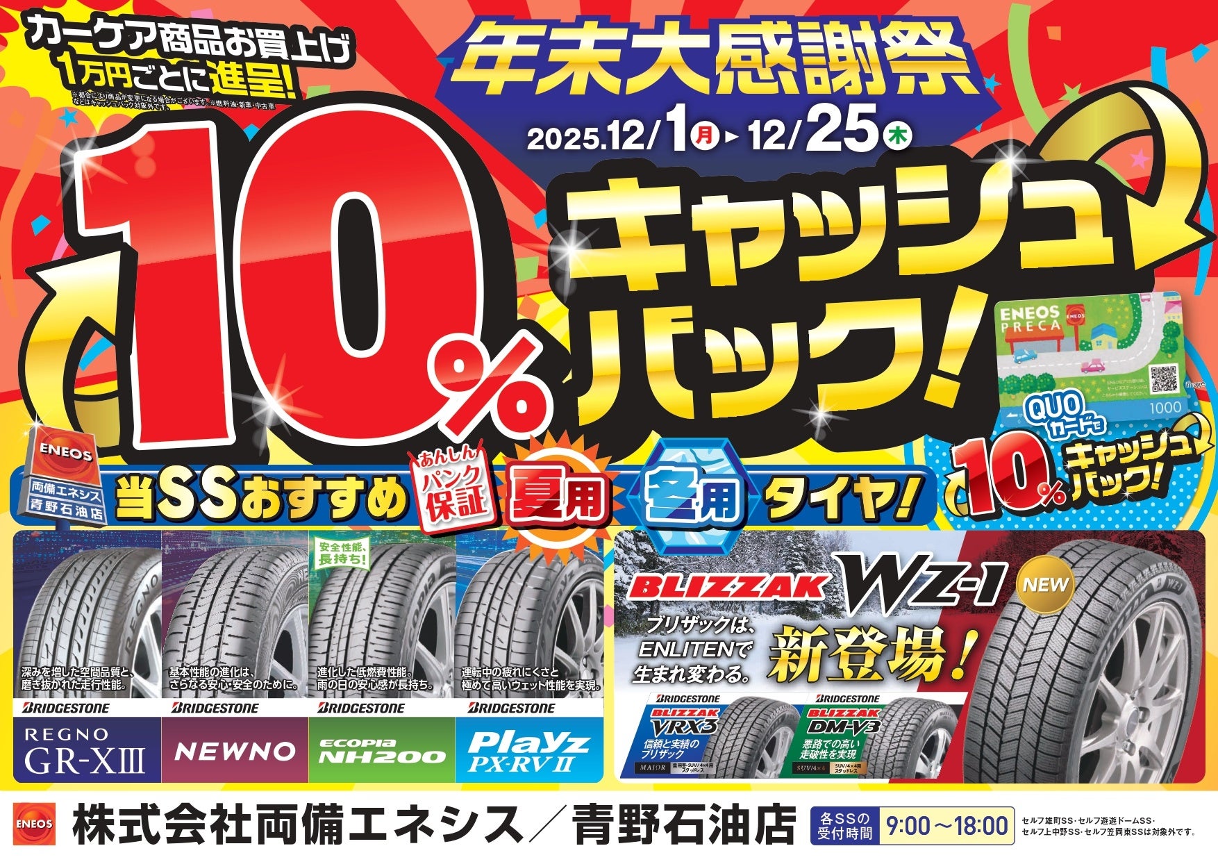 両備グループの株式会社両備エネシス(本社:岡山県岡山市中区国富1-2-13)と株式会社青野石油店(本社:岡山県津山市二宮598)は、2025年12月1日(月)から12月25日(木)までの間、運営するサービスステーションにて「年末大謝恩祭」を開催し、カーケア商品を対象に10%キャッシュバックキャンペーンを実施しています。期間中、カーケア商品を1万円(税込)お買い上げいただくごとに、QUOカード1,000円分をプレゼントいたします。