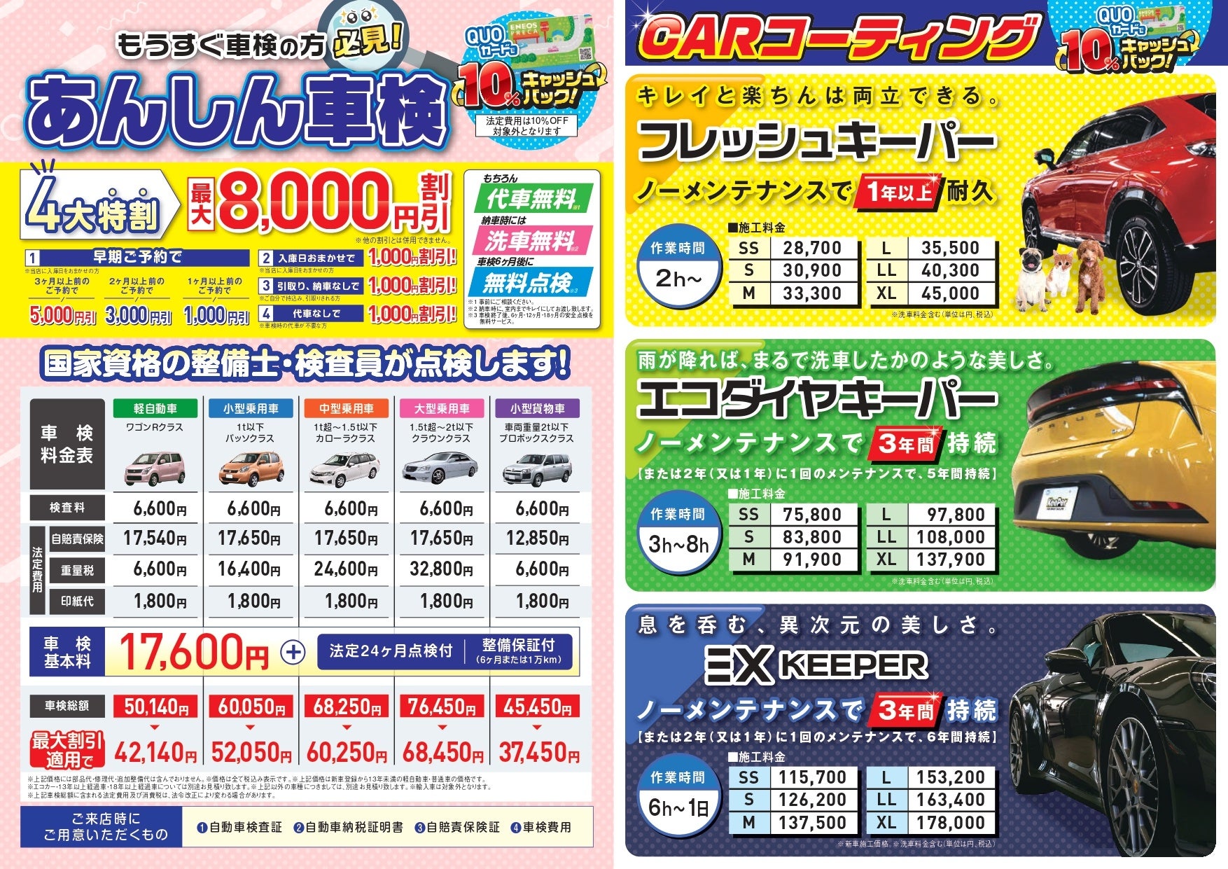 対象商品:タイヤ、コーティング、車検(法定費用除く)、オイル交換、その他のカーケア商品 など