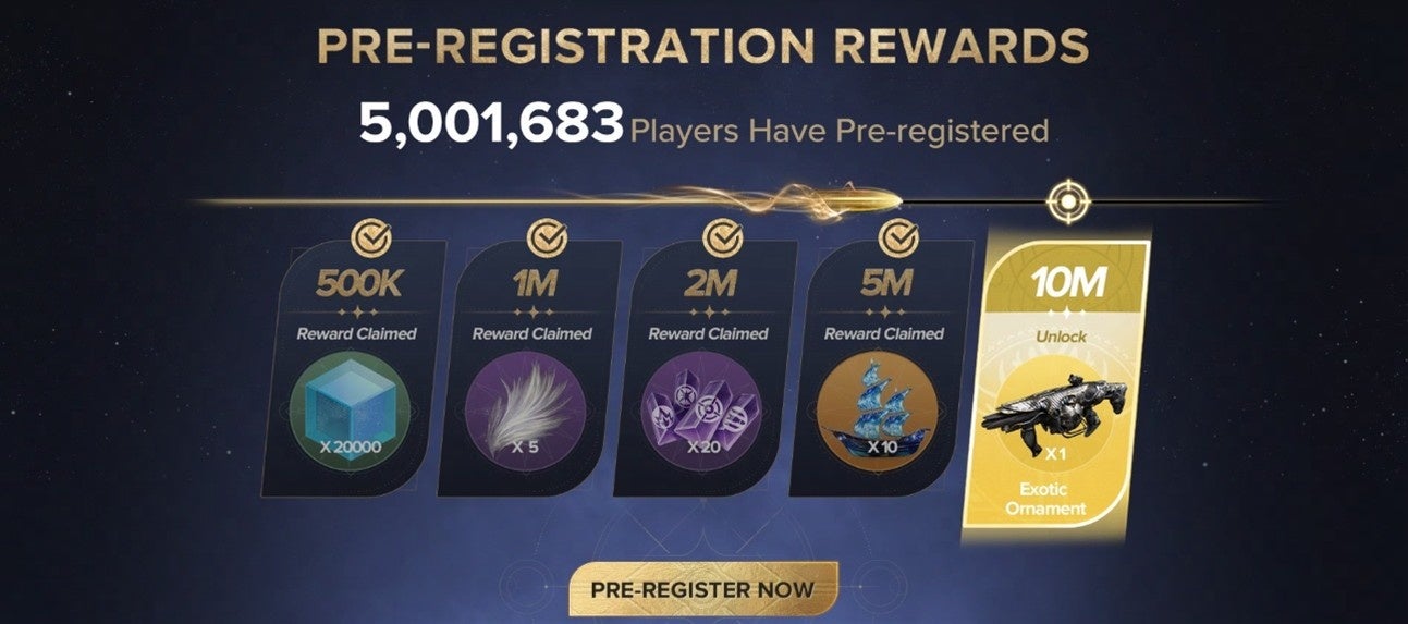 『Destiny: Rising』では、現在事前登録キャンペーンを開催中です。登録者数に応じて特典がグレードアップする本キャンペーンでは、すでに世界中で500万人が予約注文を完了しており、リリース時には10回分の無料ドローが全プレイヤーに配布されることが決定しています。華麗なビジュアルとダイナミックな戦闘、そして豊富な武器カスタマイズで世界中のプレイヤーを魅了してきた『Destiny』シリーズ。その新たな物語が、いよいよモバイルで幕を開けます。