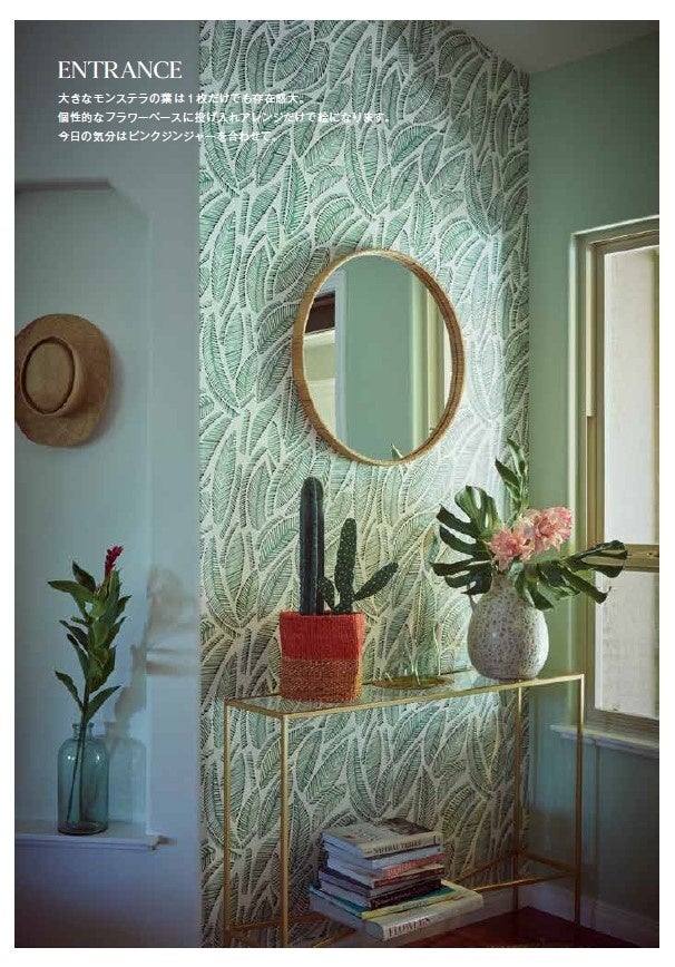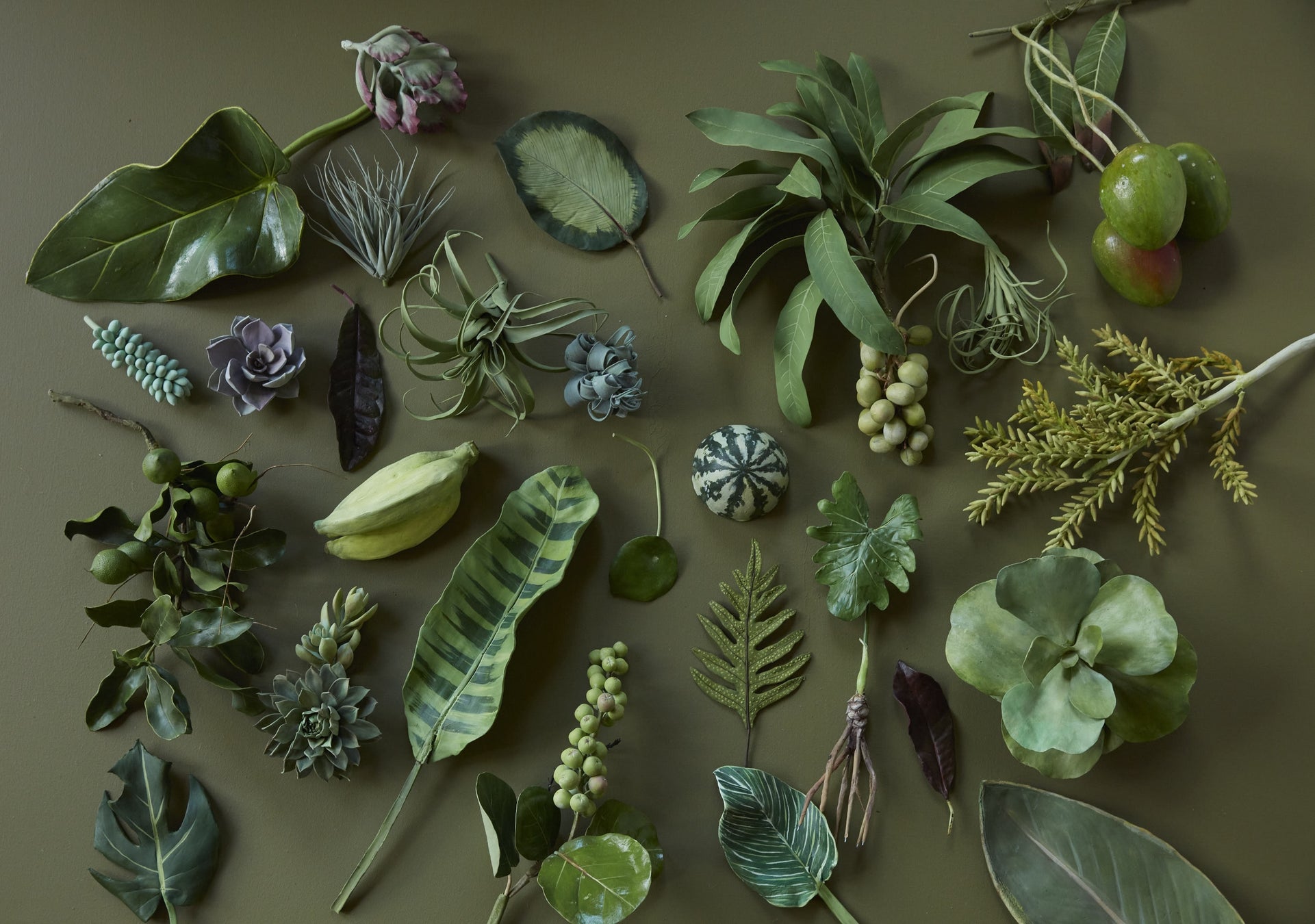 大きな葉っぱタイプ、ぶら下がるペンダントタイプ、多肉植物、盆栽など種類豊富なグリーンをインテリアとともにお見せします。卓上に飾れるフルーツやきのこも掲載。